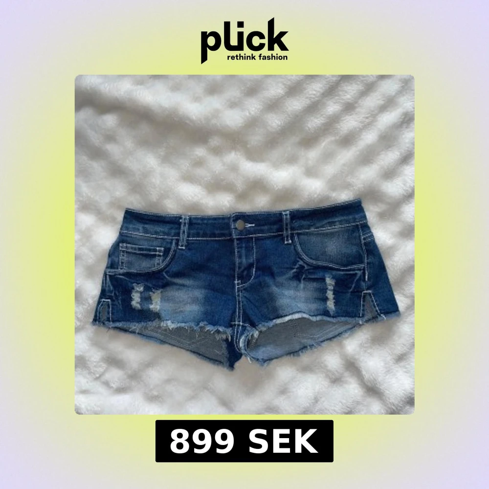 Snygga blå jeansshorts med låg midja och slitna detaljer framtill. Shortsen har fransig kant nertill och klassiska fickor både fram och bak. Köpte på en second han affär i mos. Nypris för 1200kr.