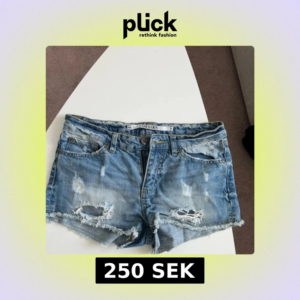 Snygga blå jeansshorts från Fabulous i storlek S. De har slitna detaljer, fransig kant och klassisk femficksmodell. Perfekta för sommaren med sin avslappnade och trendiga look. Passar dig som gillar en lite tuffare stil.