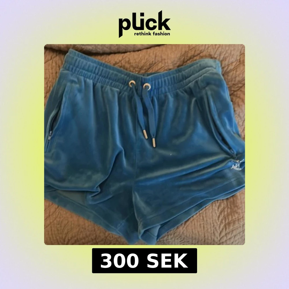 Snygga blå velourshorts från Juicy Couture med glittrande stenar som bildar texten 'Juicy' på baksidan. Shortsen har en elastisk midja med dragsko och praktiska fickor med dragkedja. Perfekta för en avslappnad och stilren look.