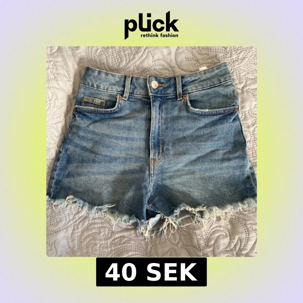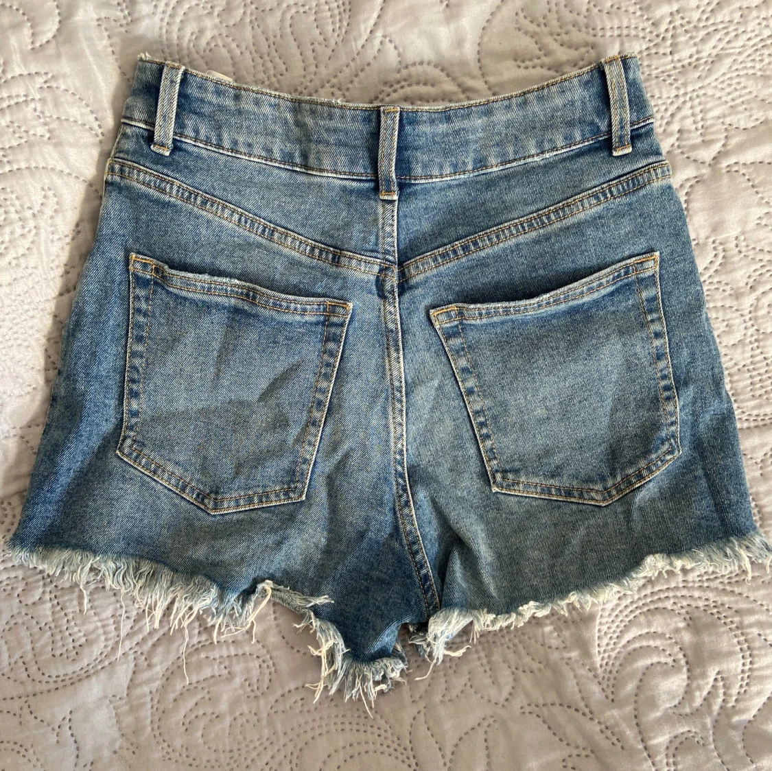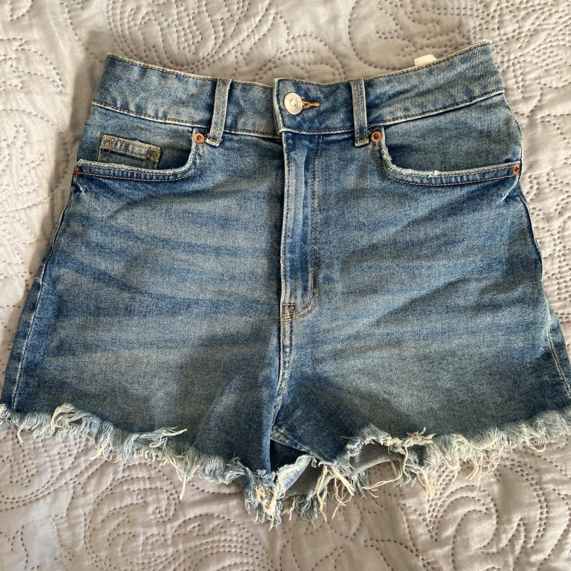 Blå jeansshorts med hög midja och fransig kant längst ner. Knapp och dragkedja framtill. Kontakta vid funderingar 💗