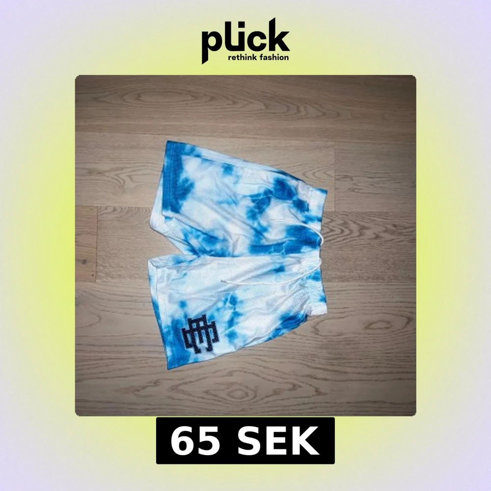 Säljer ett par blåvita meshshorts från EE med batikmönster och svart logga på benet. Shortsen har elastisk midja och är tillverkade i luftig polyester, perfekta för sommaren eller träning.