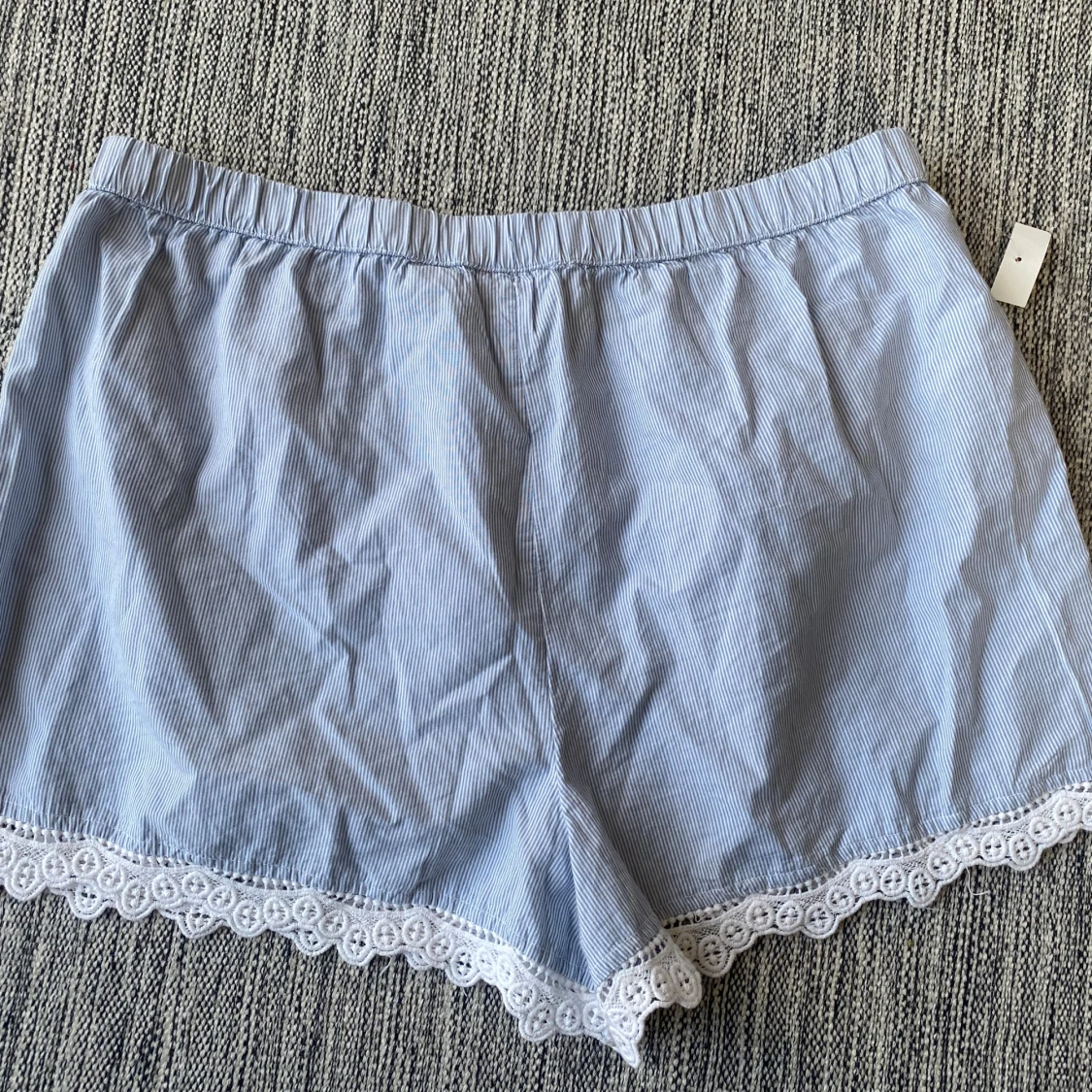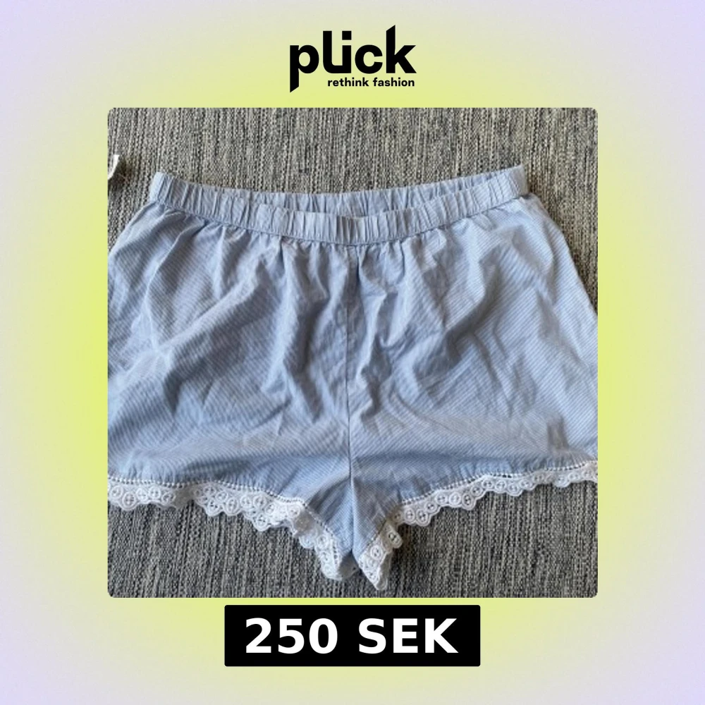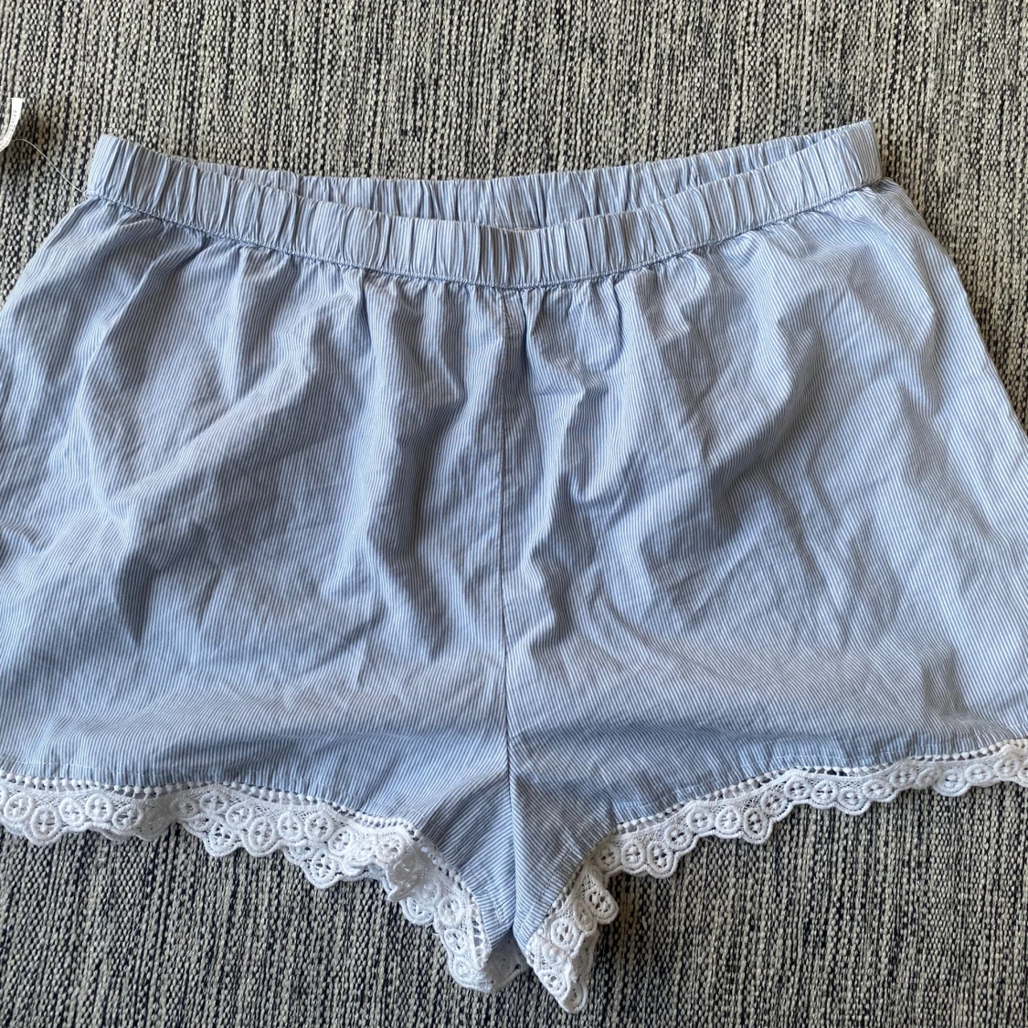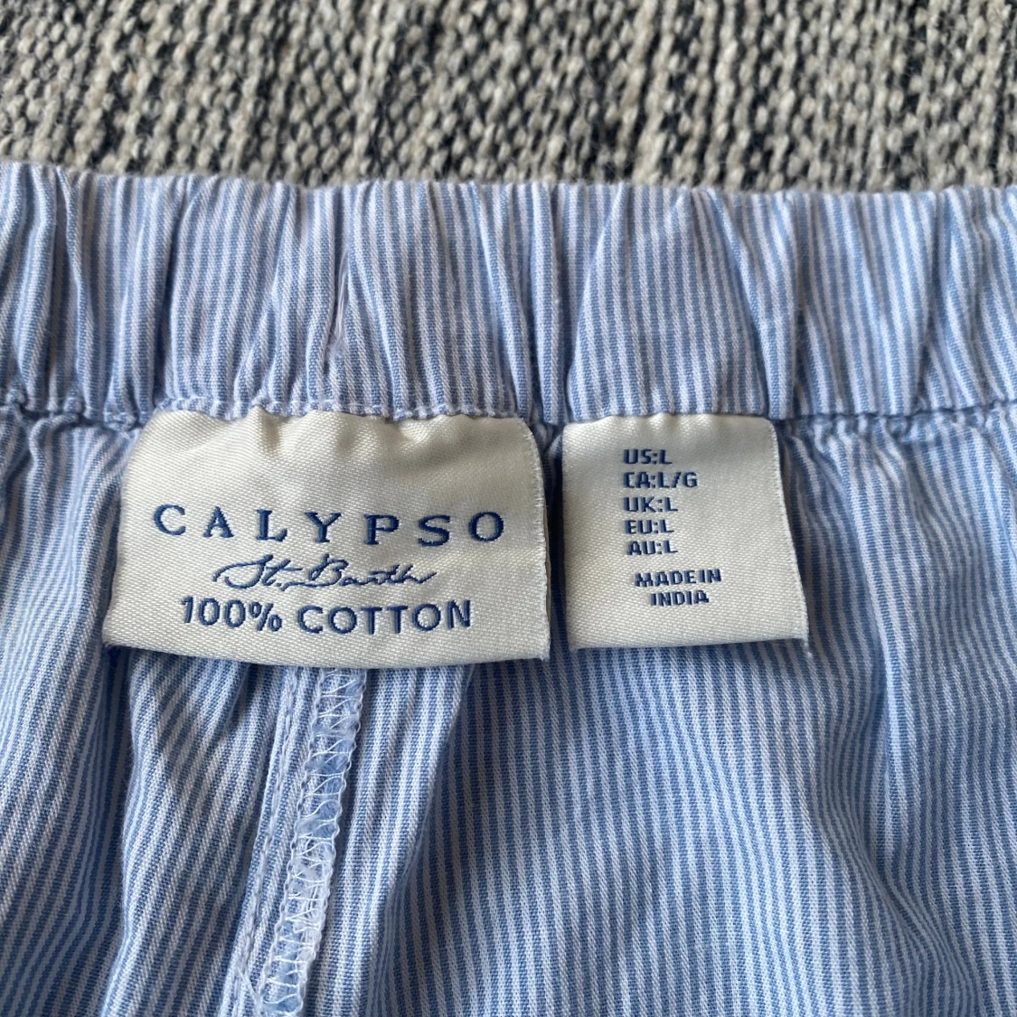 Snygga blåvita pyjamasshorts från Calypso St. Barth i 100% bomull. De har tunna ränder och elastisk midja för skön passform. Nederkanten är dekorerad med vit spets som ger en extra touch. Mått Midjan: ca 43 cm Total längd: ca 37 cm 100% bomull Kommer från ett djur och rökfritt hem.