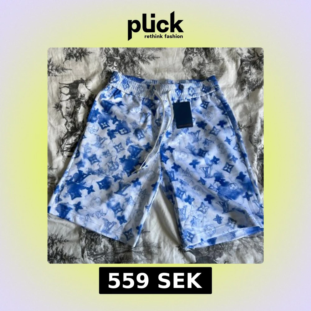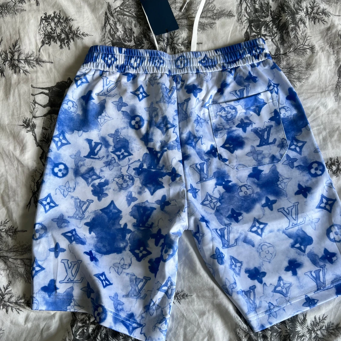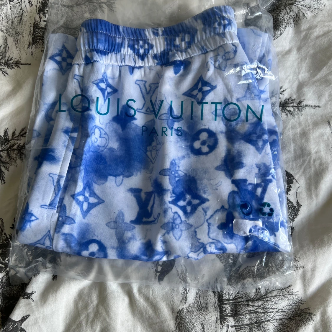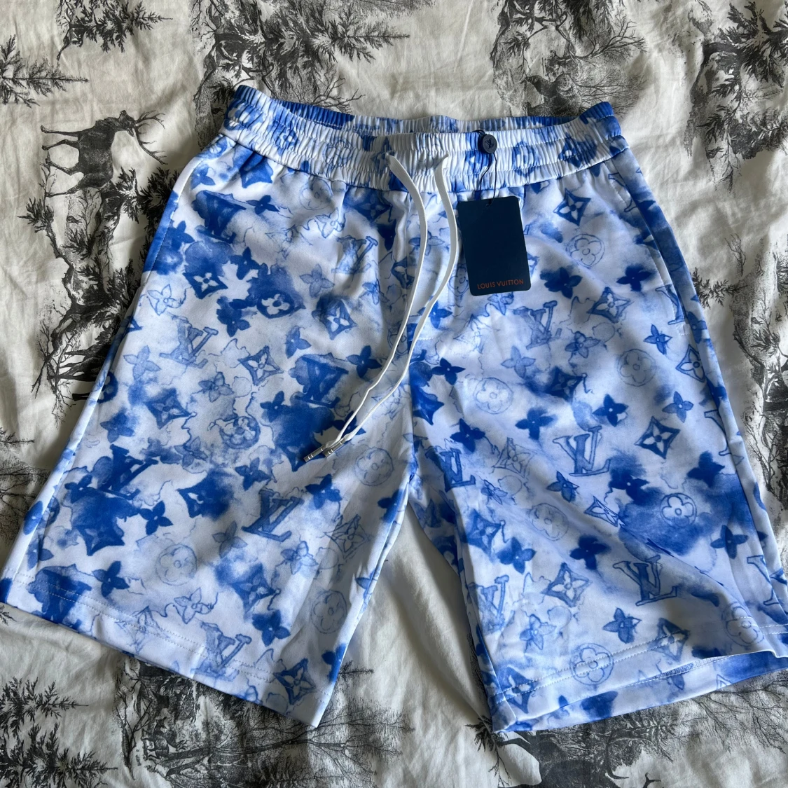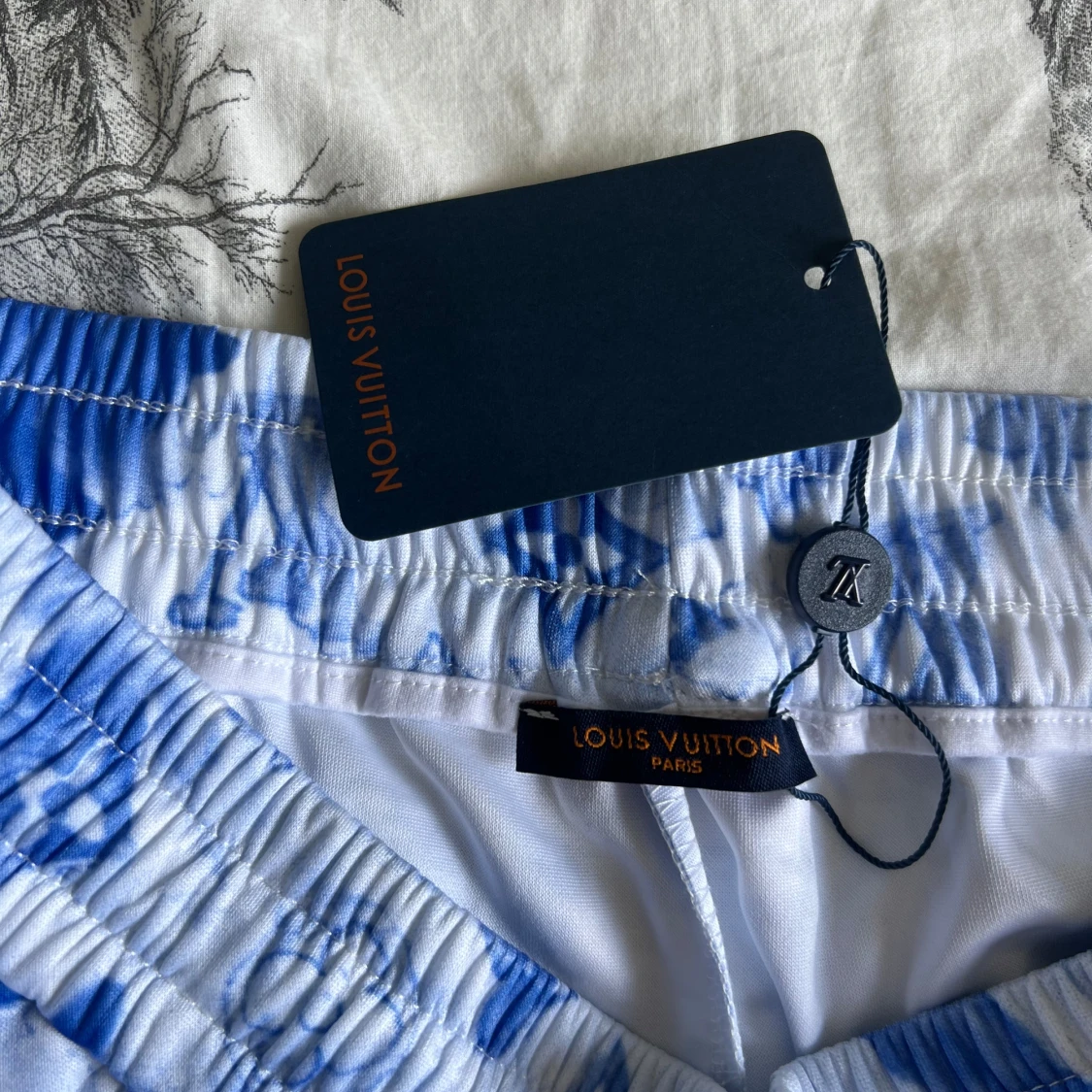 Säljer ett par blåvita shorts från Louis Vuitton med tydligt LV-mönster och elastisk midja med snörning. Shortsen har en bakficka och är perfekta för sommaren. Materialet känns mjukt och svalt, perfekt för varma dagar.