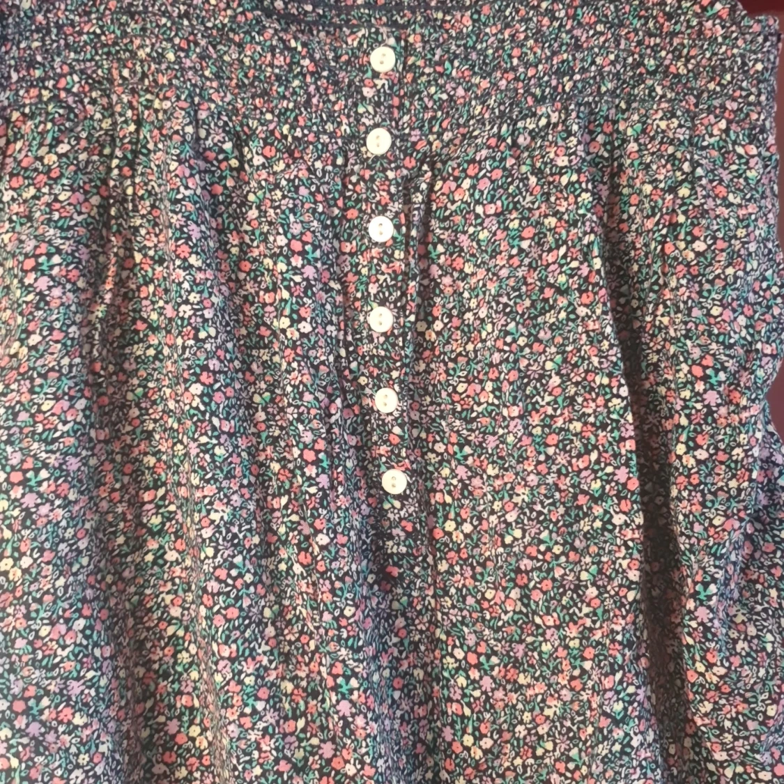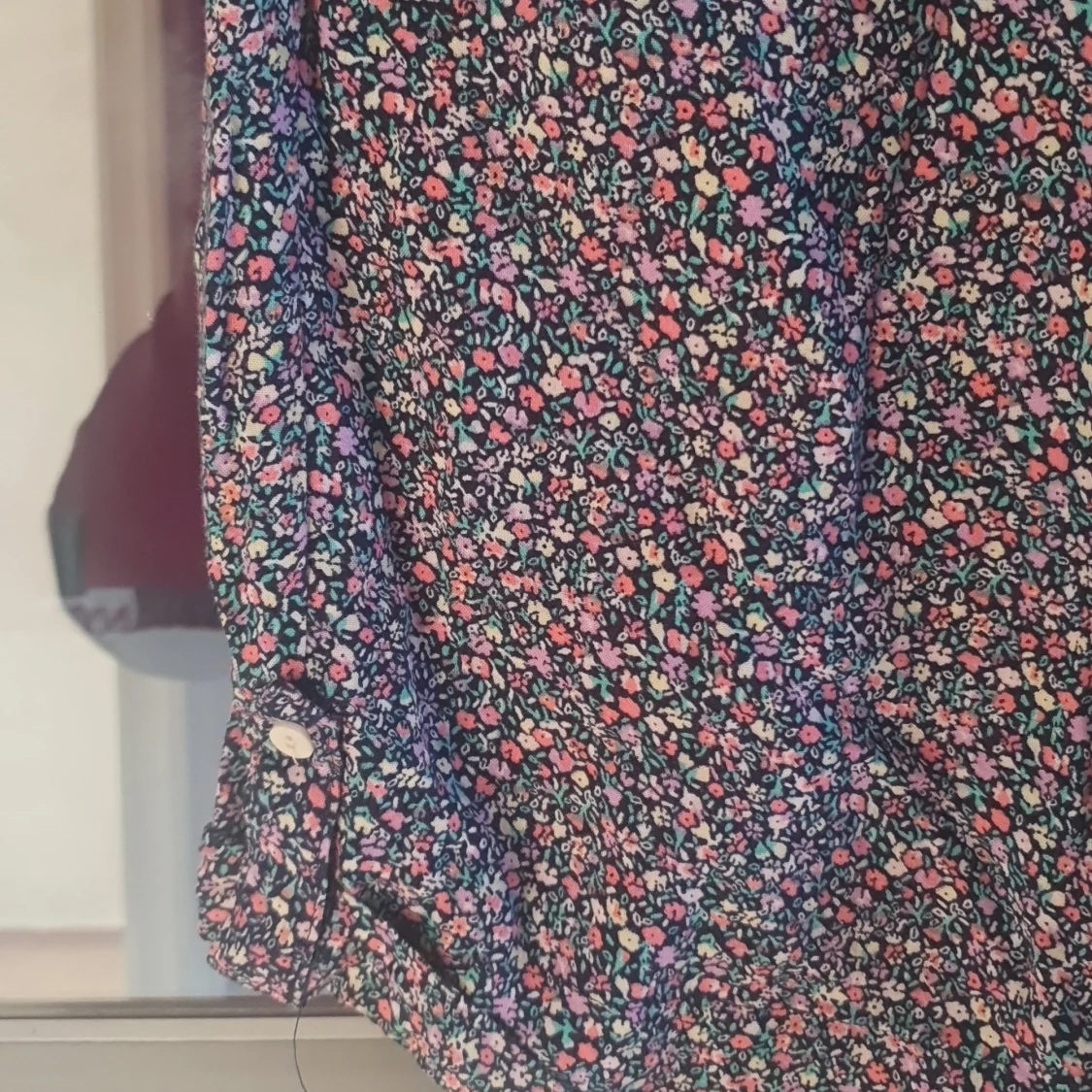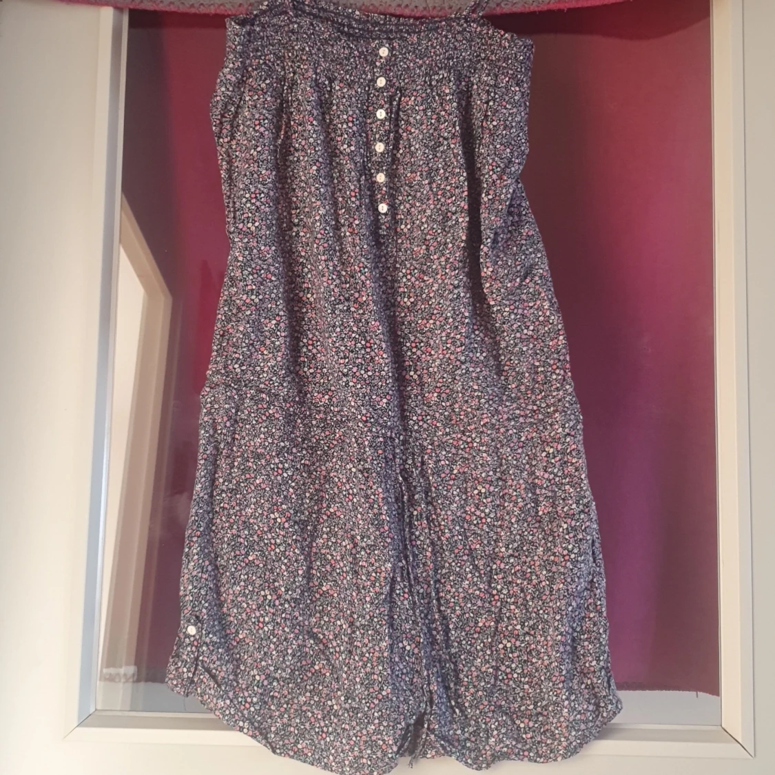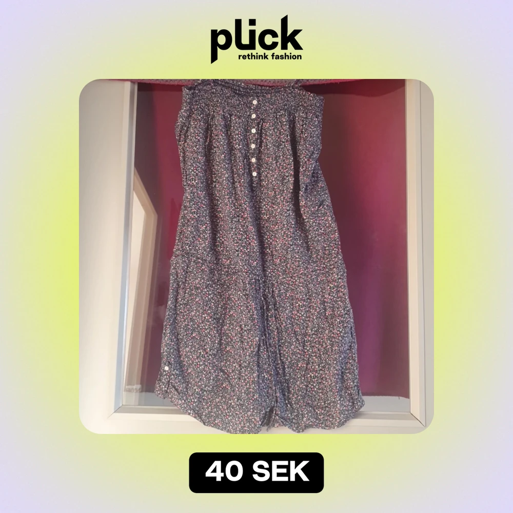 Söt blommig jympsuit i mörkblått med små rosa och vita blommor. Den har knappar framtill och en bekväm passform. Perfekt för vår och sommar! 🌸