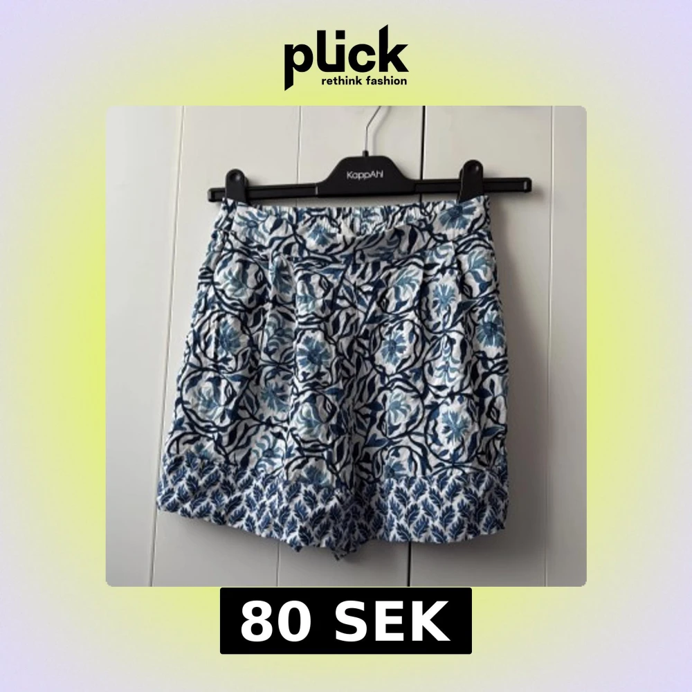 Snygga shorts med blått och vitt blommönster från H&M. De har elastisk midja och är tillverkade i ett mjukt bomullsmaterial. Perfekta för varma dagar och ger en fräsch sommarkänsla.