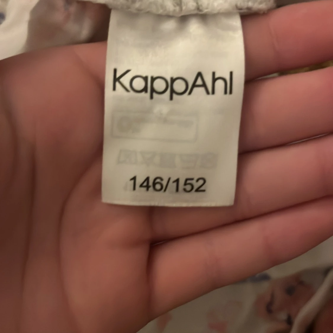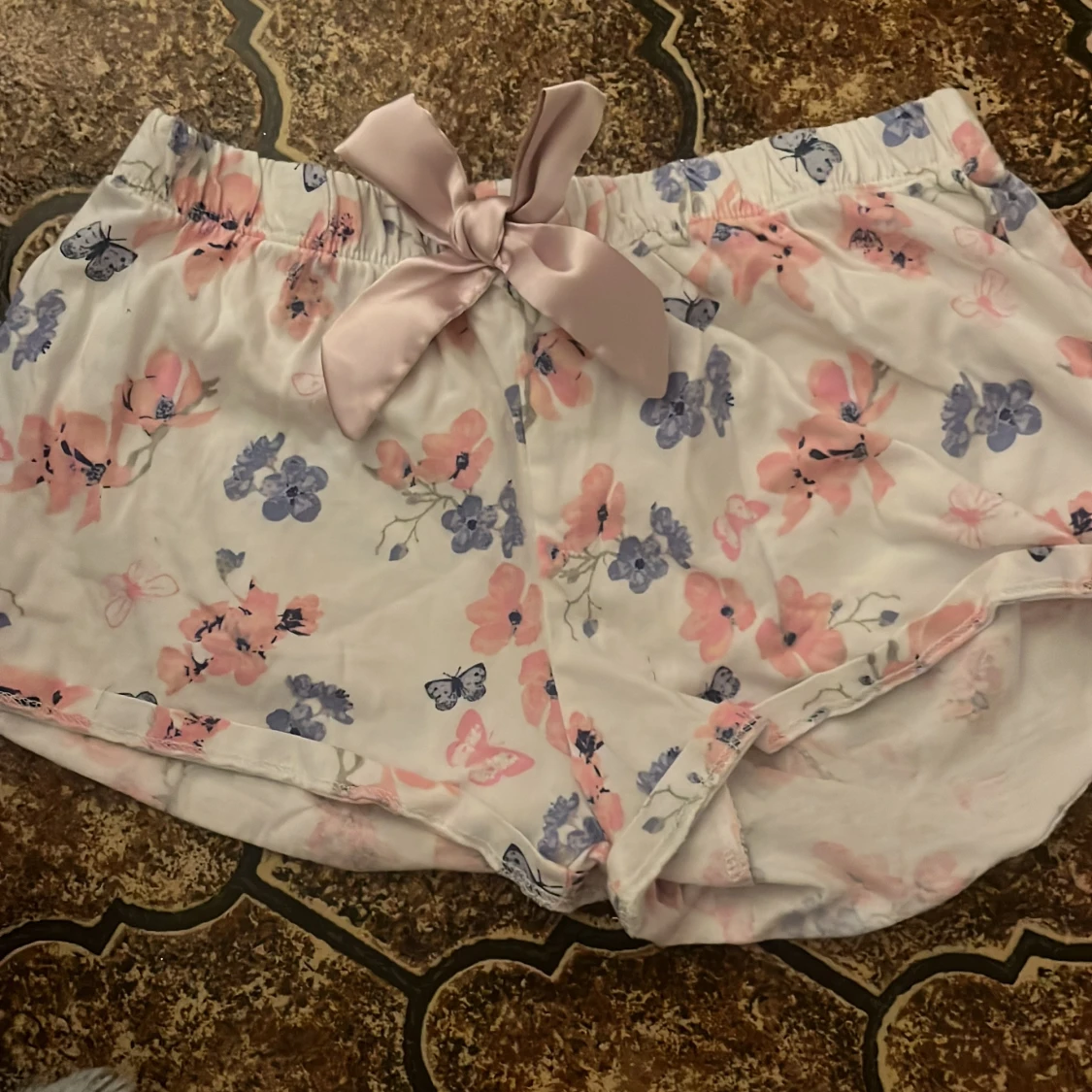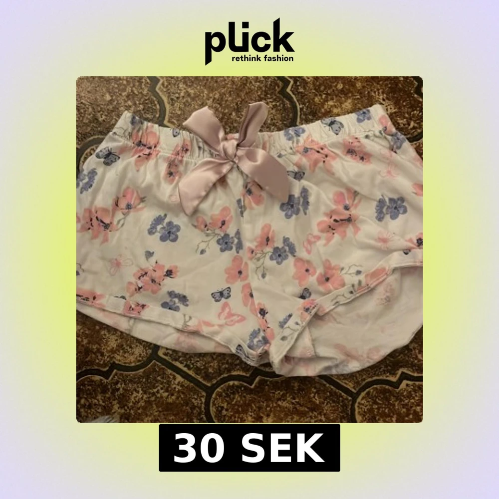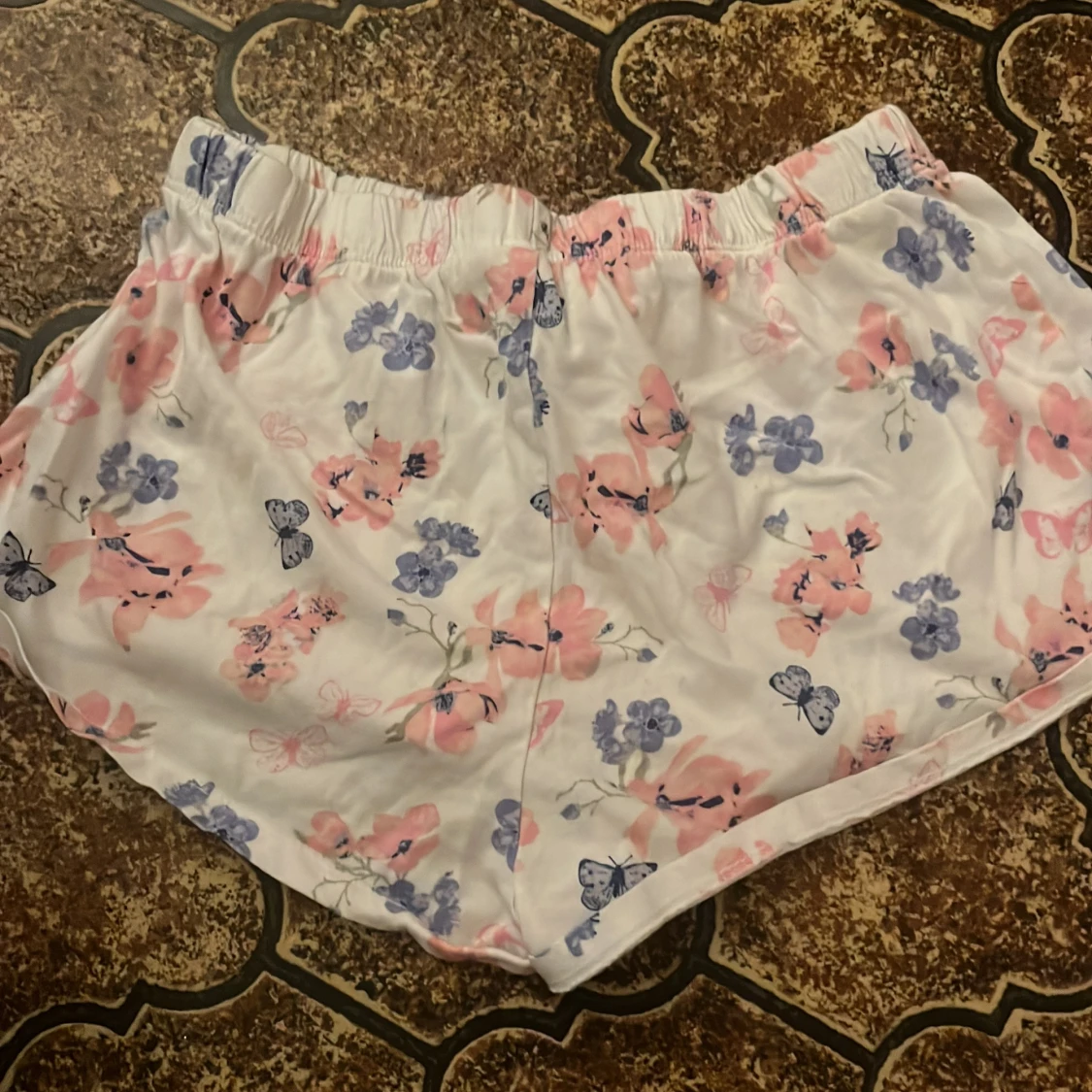 Supersöta vita shorts från KappAhl med rosa och lila blommor, fjärilar och en stor ljusrosa rosett framtill. Mjukt och lätt material, perfekt för varma dagar. Elastisk midja för skön passform.