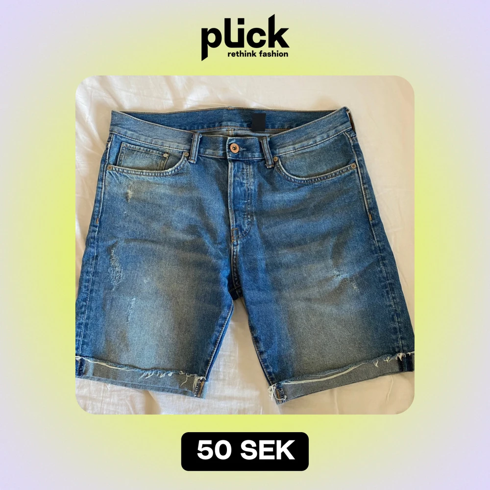 Säljer ett par snygga blå jeansshorts i straight fit. De har en klassisk femficksdesign och slitna detaljer för en cool look. Perfekta för sommaren och avslappnade dagar. Shortsen är i bra skick och gjorda av denim.