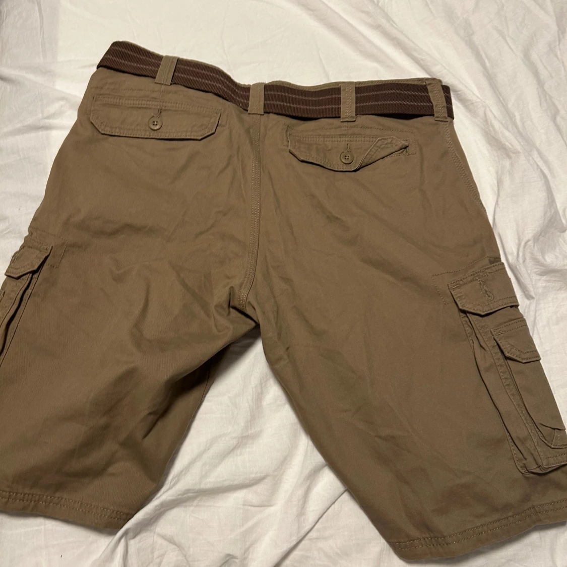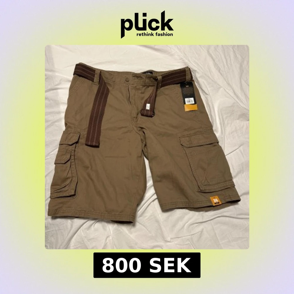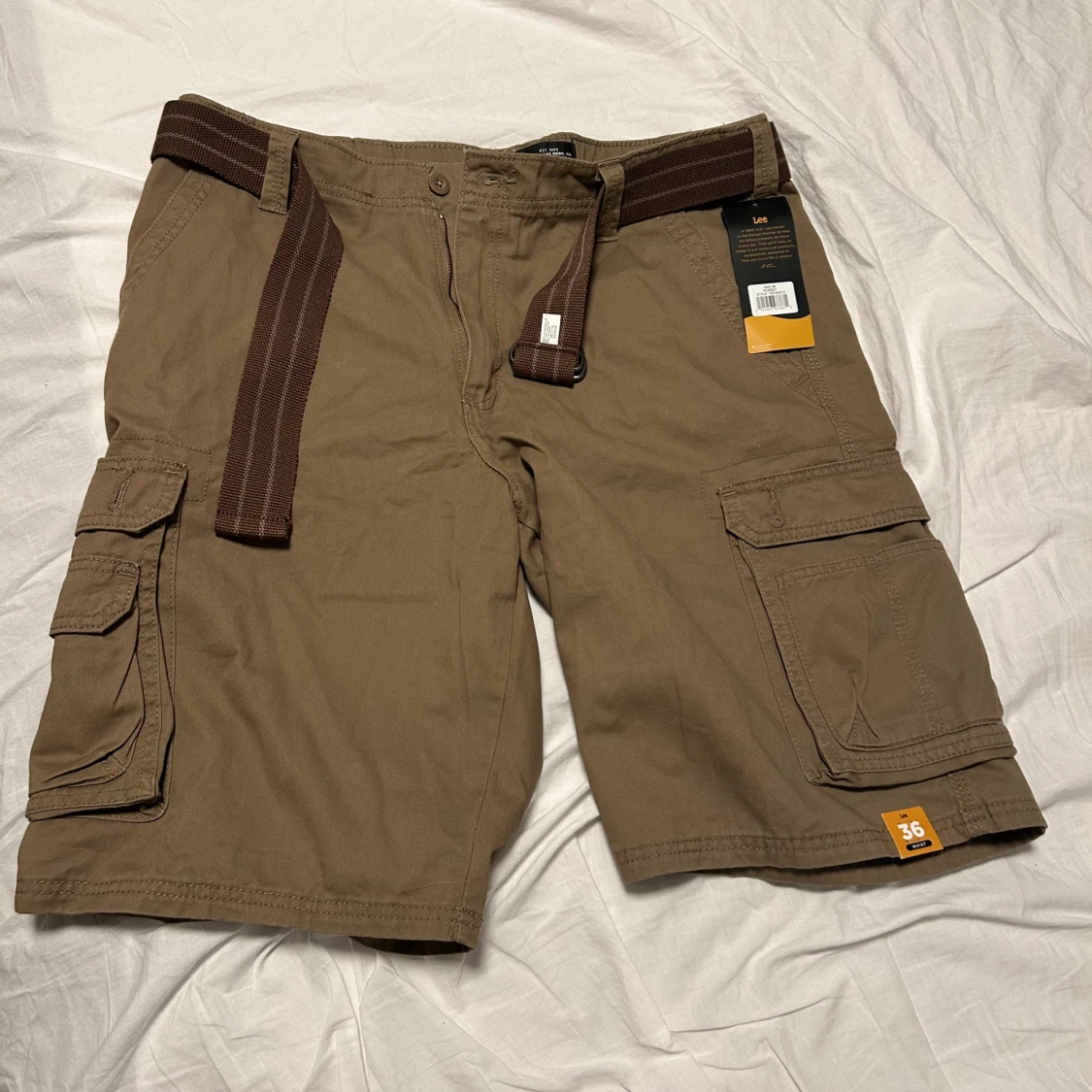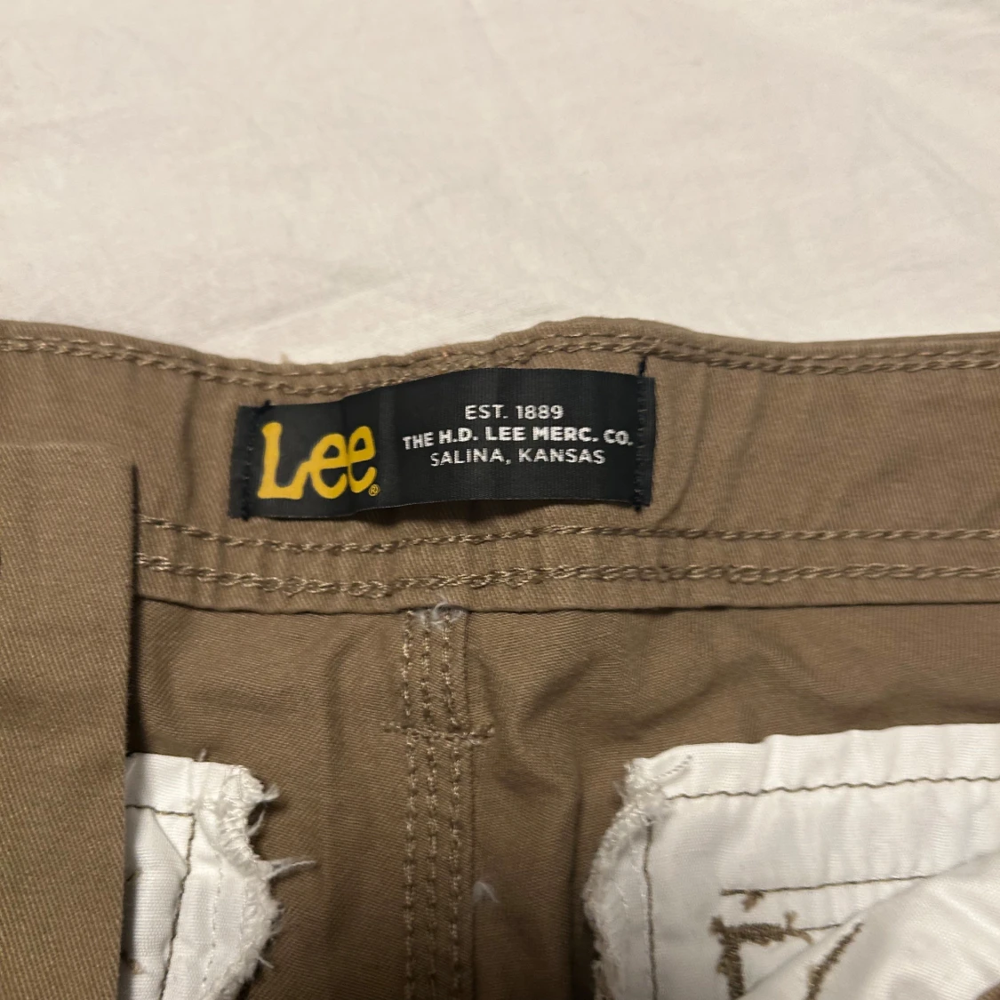 Säljer ett par bruna/gröna cargo shorts från Lee med flera praktiska fickor och medföljande brunt tygbälte. Shortsen har normal passform och är tillverkade i mjuk bomull, perfekta för chill dagar. Klassisk design med knapp och dragkedja framtill.