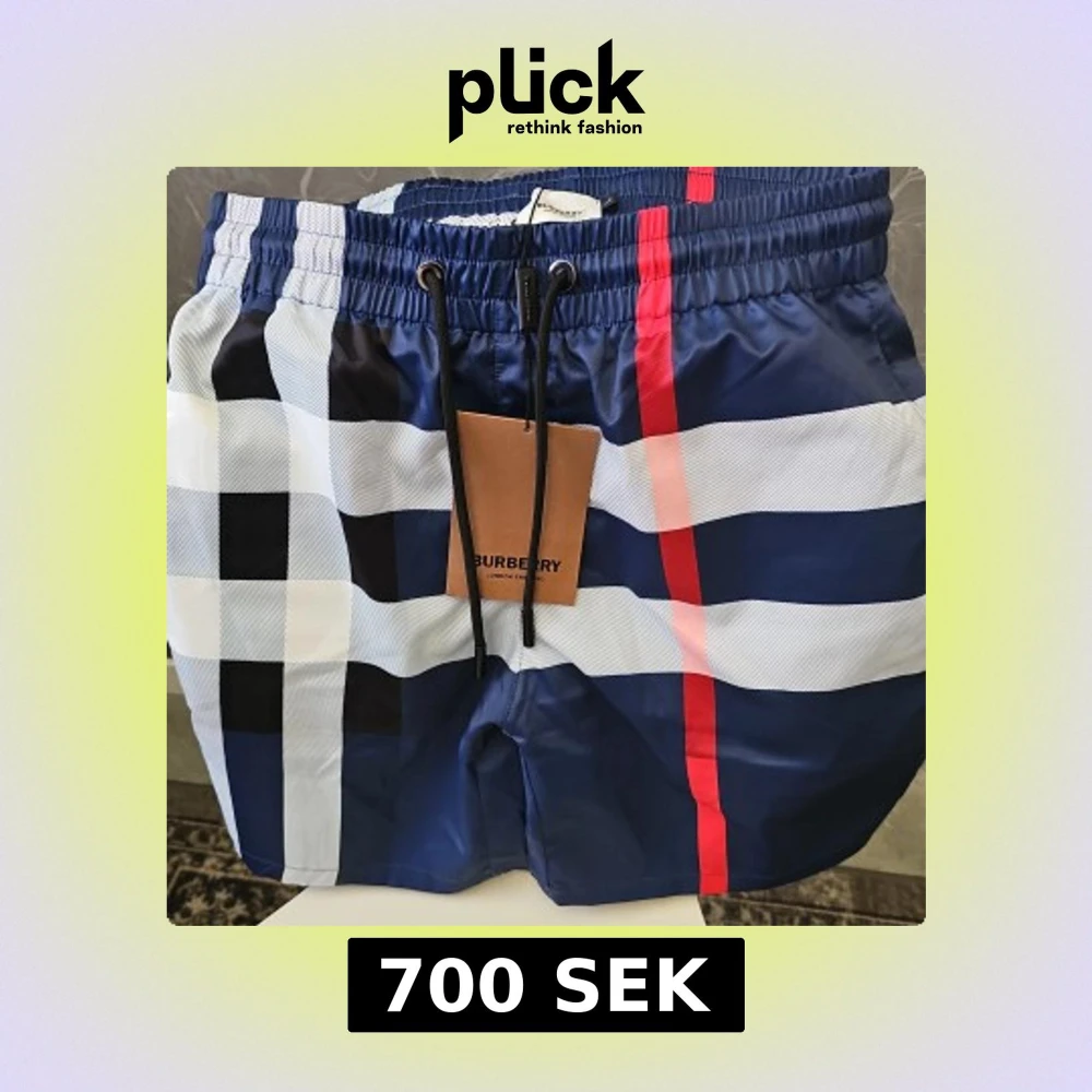 Snygga badshorts från Burberry i blått med klassiskt rutigt mönster och röda detaljer. Shortsen har snörning i midjan och är tillverkade i ett lätt syntetmaterial med innerbyxa i mesh. Perfekta för stranden eller poolen.