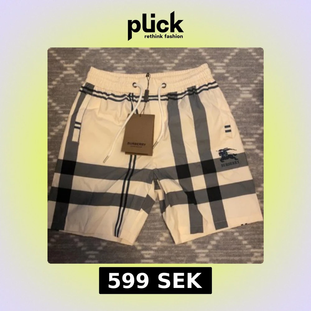 Snygga badshorts från Burberry i beige med det ikoniska rutmönstret i svart och grått. Shortsen har snörning i midjan och sidofickor. Perfekta för sommaren och strandhäng.