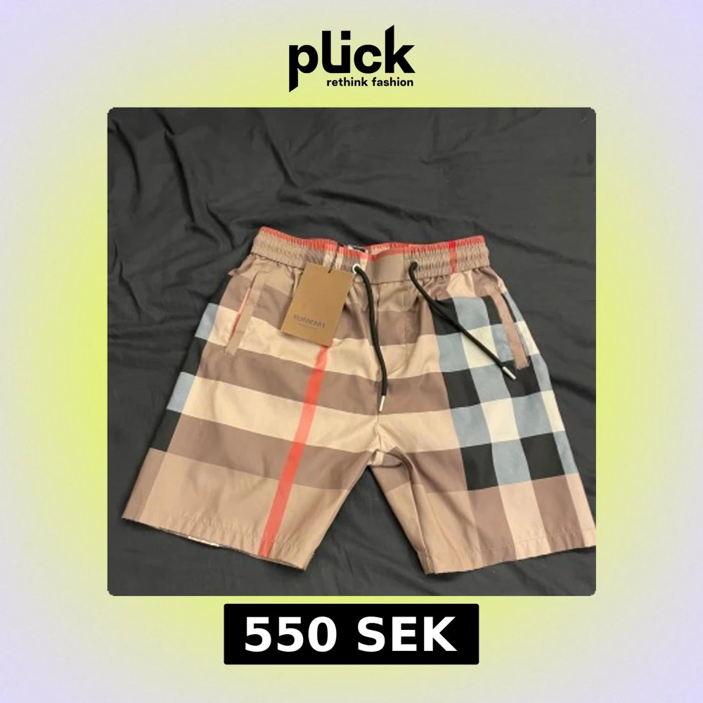 Snygga Burberry shorts med rutigt mönster i beige, svart, vit, grå och röd. De har elastisk midja med svart snörning och sidofickor. Materialet är mjukt och perfekt för varma dagar. Pris kan diskuteras.