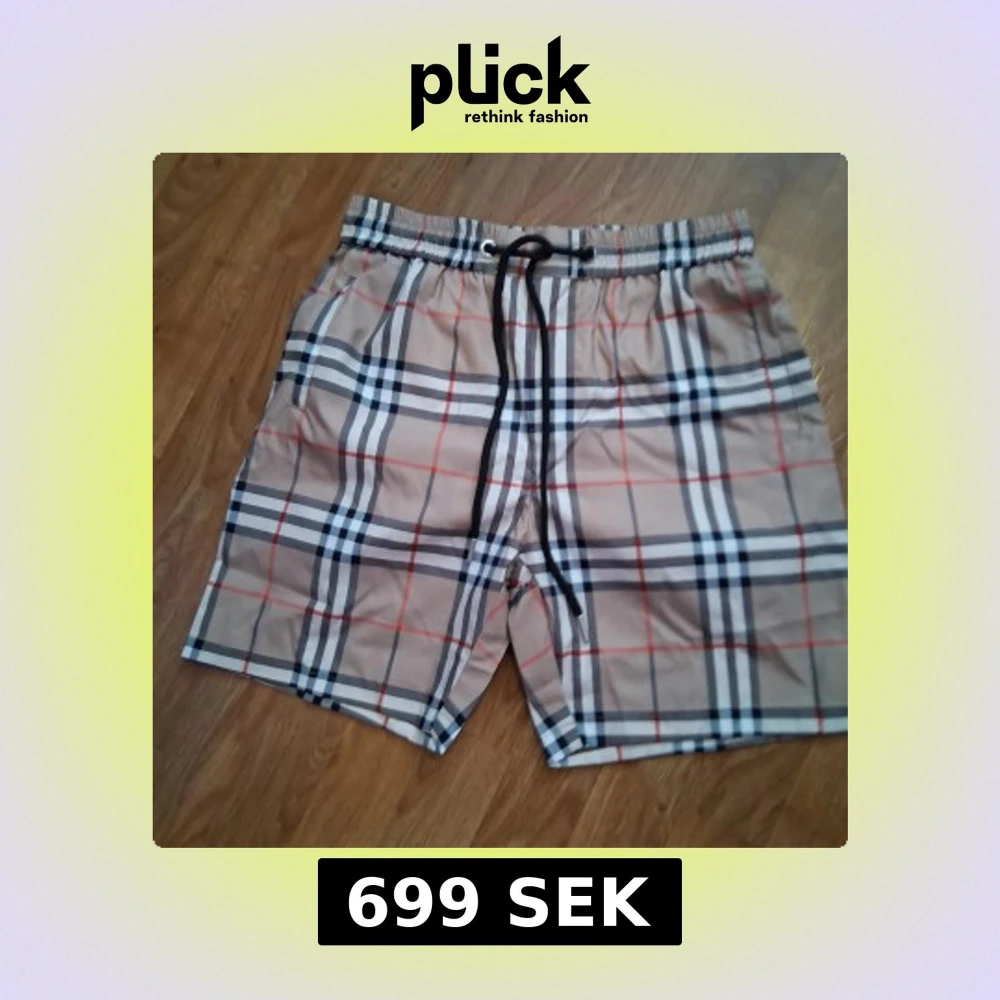 Snygga beige shorts från Burberry med klassiskt rutigt mönster i svart, vitt och rött. De har elastisk midja med svart snörning och sidofickor, samt en bakficka. Perfekta för sommaren och ger en clean och trendig look.