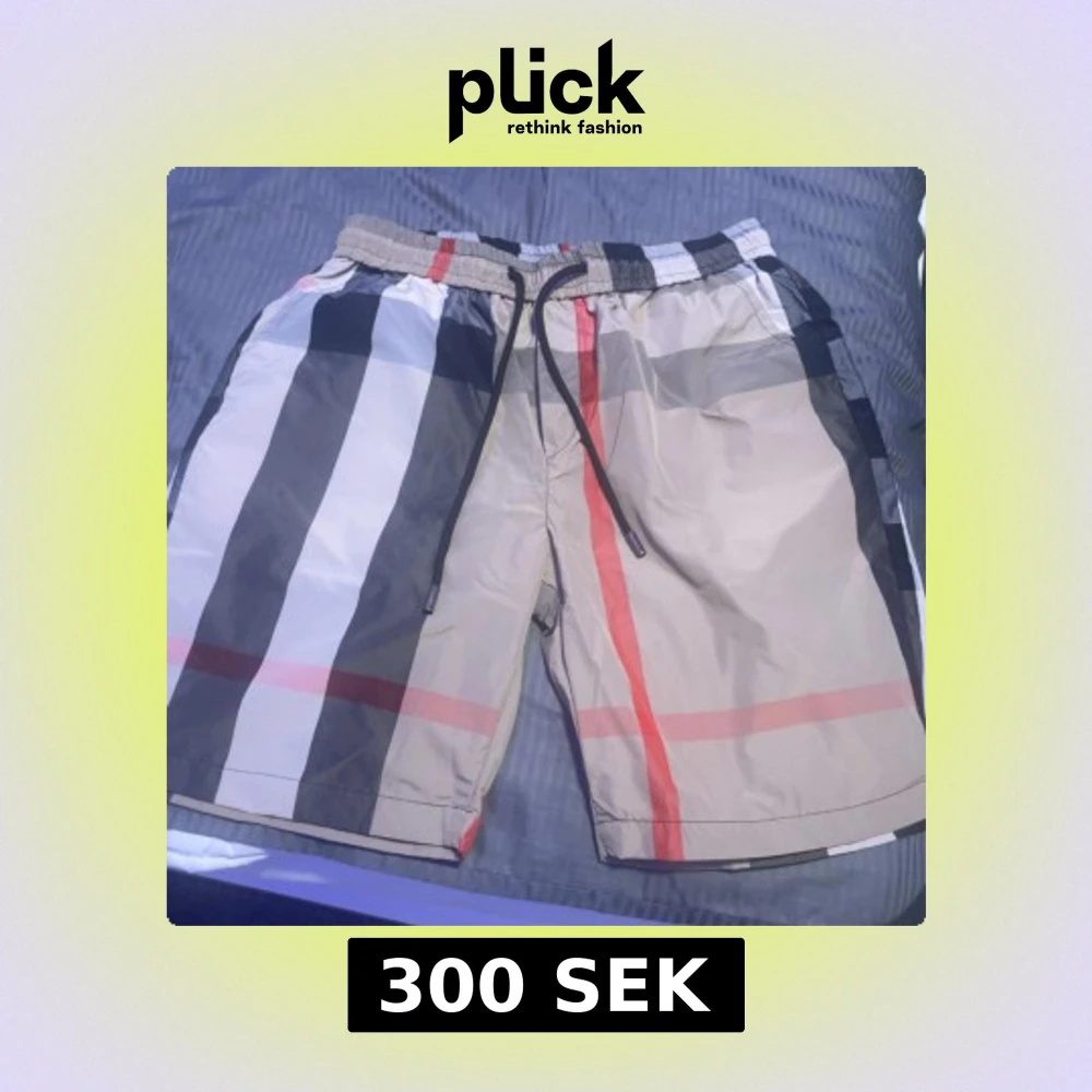 Snygga Burberry shorts med klassiskt rutigt mönster i beige, svart, vitt och röda detaljer. De har elastisk midja med svart snörning och är tillverkade i ett lätt syntetmaterial, perfekta för sommaren. Stilen är loose och de har en bakficka för extra funktion.