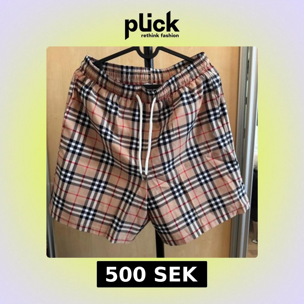 Snygga beige shorts från Burberry med klassiskt rutigt mönster i svart, vitt och rött. Shortsen har resår i midjan och vit snörning för justerbar passform. Perfekta för sommaren och har en exklusiv känsla. Stl L och passar folk mellan 170-185