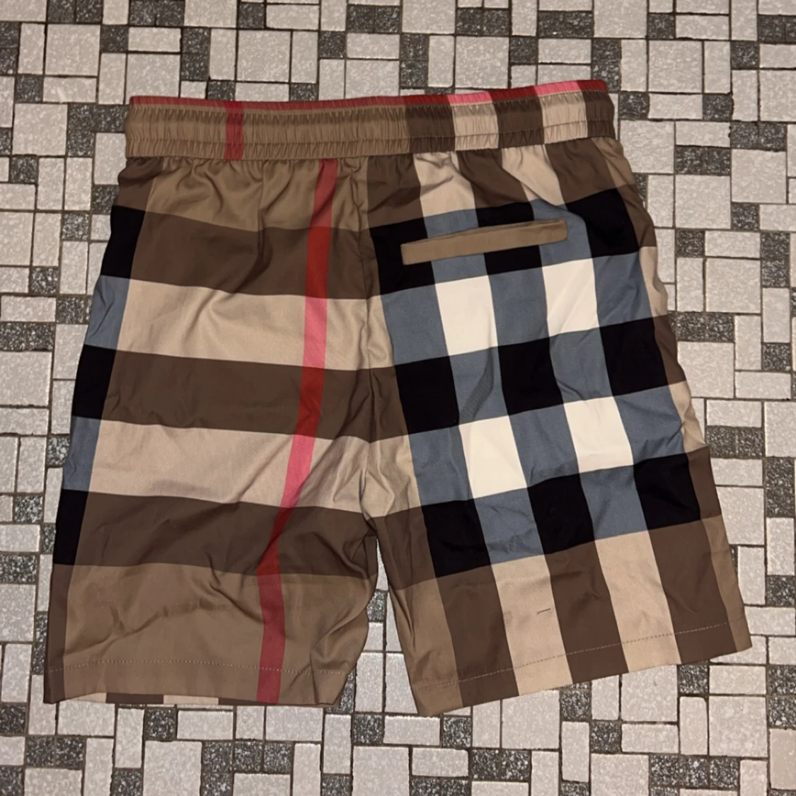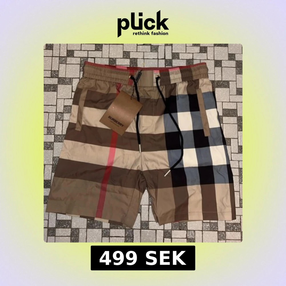 Helt nya Snygga Burberry shorts med klassiskt rutigt mönster i beige, brunt, svart, vitt och blått samt en röd detalj. De har elastisk midja med svart snörning och praktiska fickor fram och bak. Perfekt för dig som vill ha en ikonisk streetstyle-look. Dom är storlek L men passar M