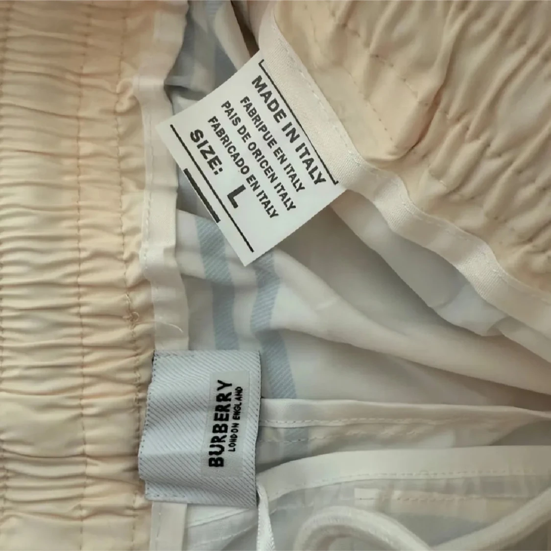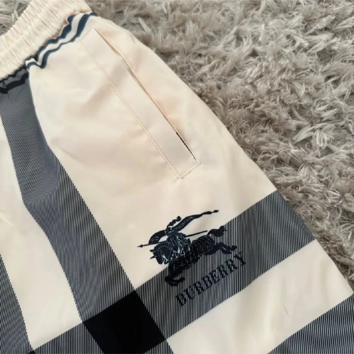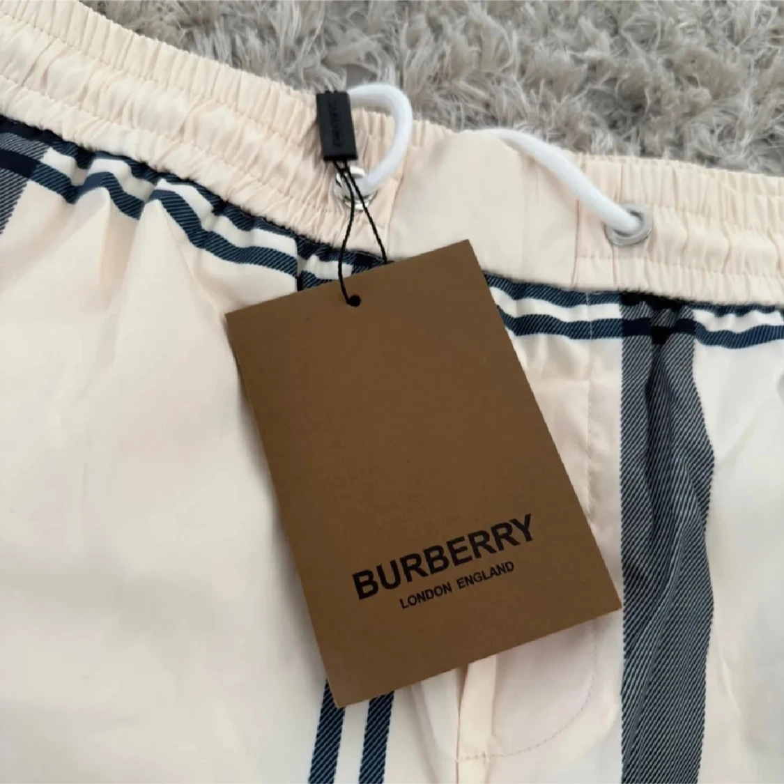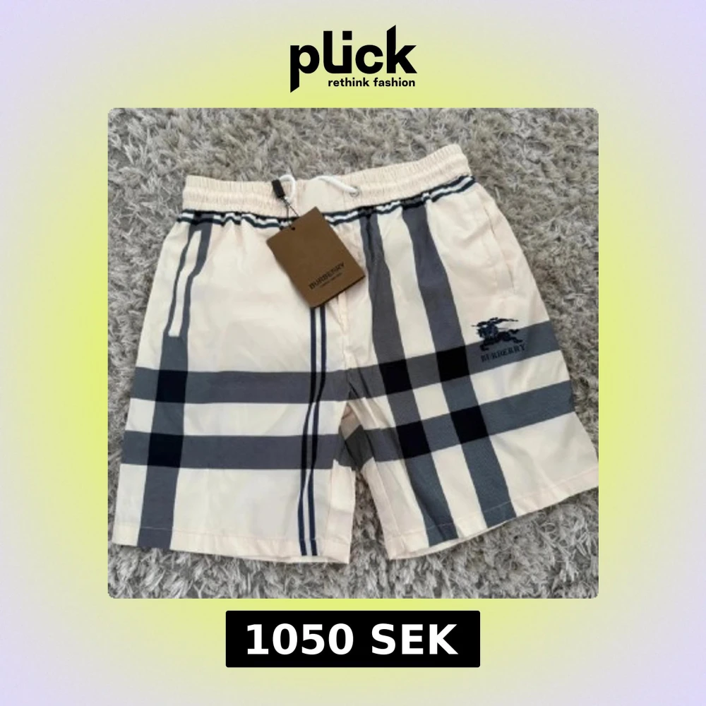 Snygga badshorts från Burberry i klassiskt beige och svart rutigt mönster. Shortsen har elastisk midja med vit snörning och Burberry-logga broderad på ena benet. Perfekta för sommaren.