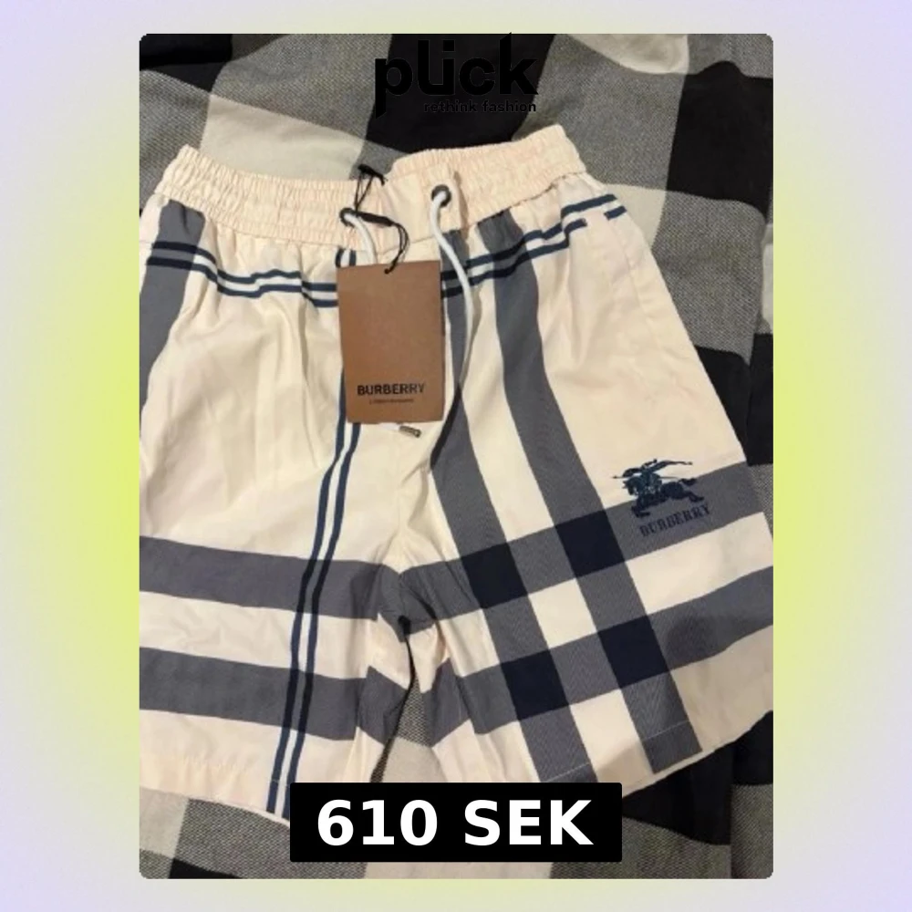 Snygga vita och mörkblå rutiga shorts från Burberry med klassiskt mönster och broderad logga på benet. Shortsen har elastisk midja med snörning för skön passform. Perfekta för sommaren och ger en lyxig känsla till din outfit.