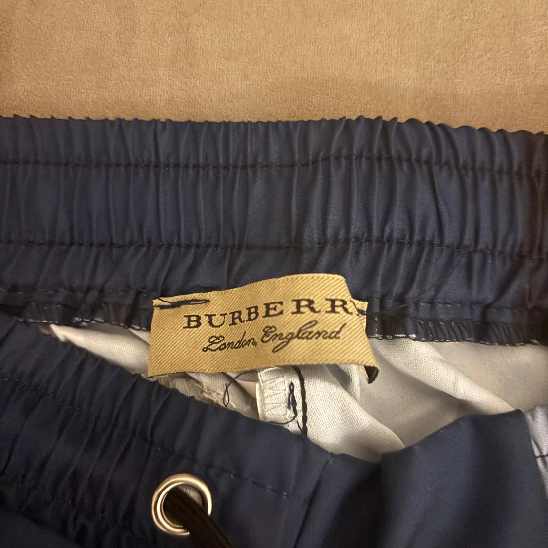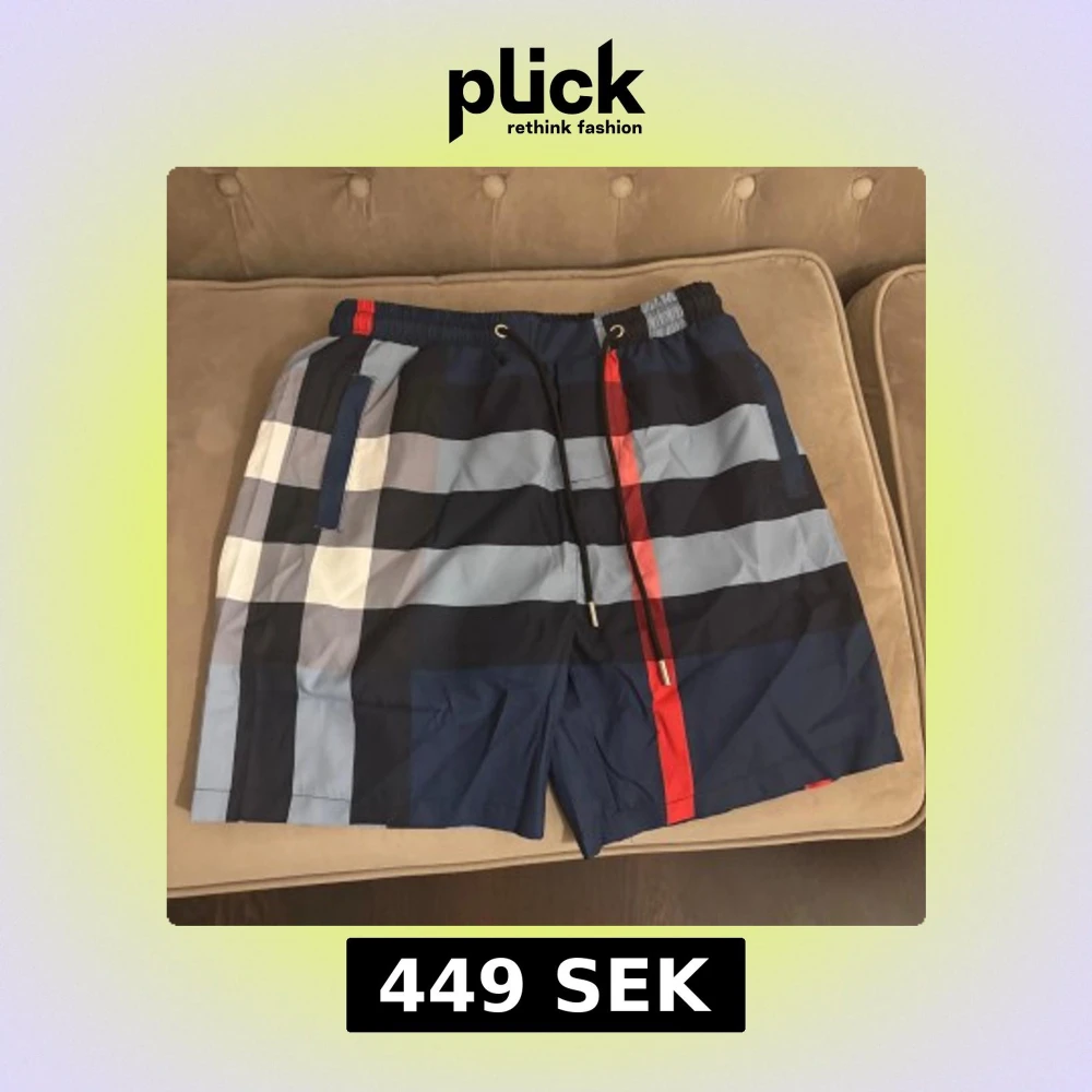 Helt nya och oanvända shorts från Burberry med breda ränder i marinblått, ljusblått, grått, vitt och en röd detalj. De har elastisk midja med snörning och två sidofickor. Perfekta för sommaren och har en modern, loose passform.