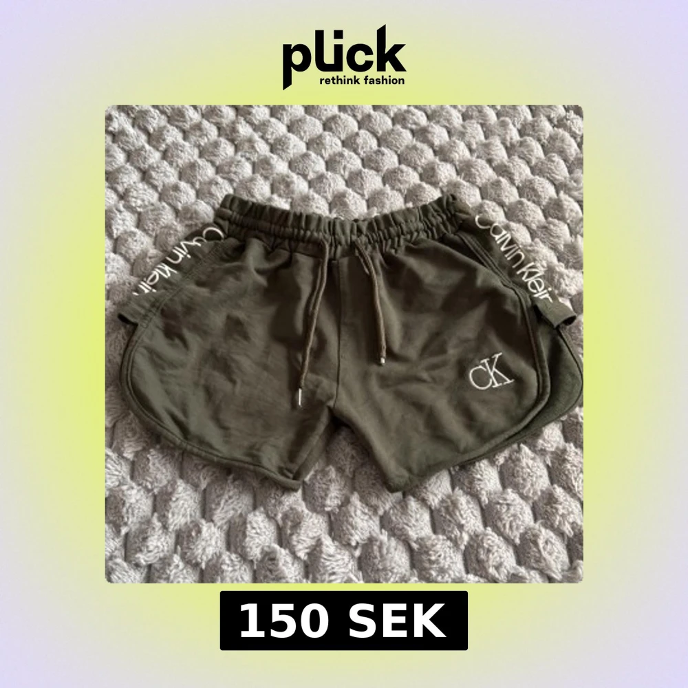 Snygga olivgröna shorts från Calvin Klein med vit logga på ena benet och Calvin Klein-tryck längs sidorna. De har elastisk midja med snörning och är tillverkade i mjuk bomull. Perfekta för chill dagar eller träning.