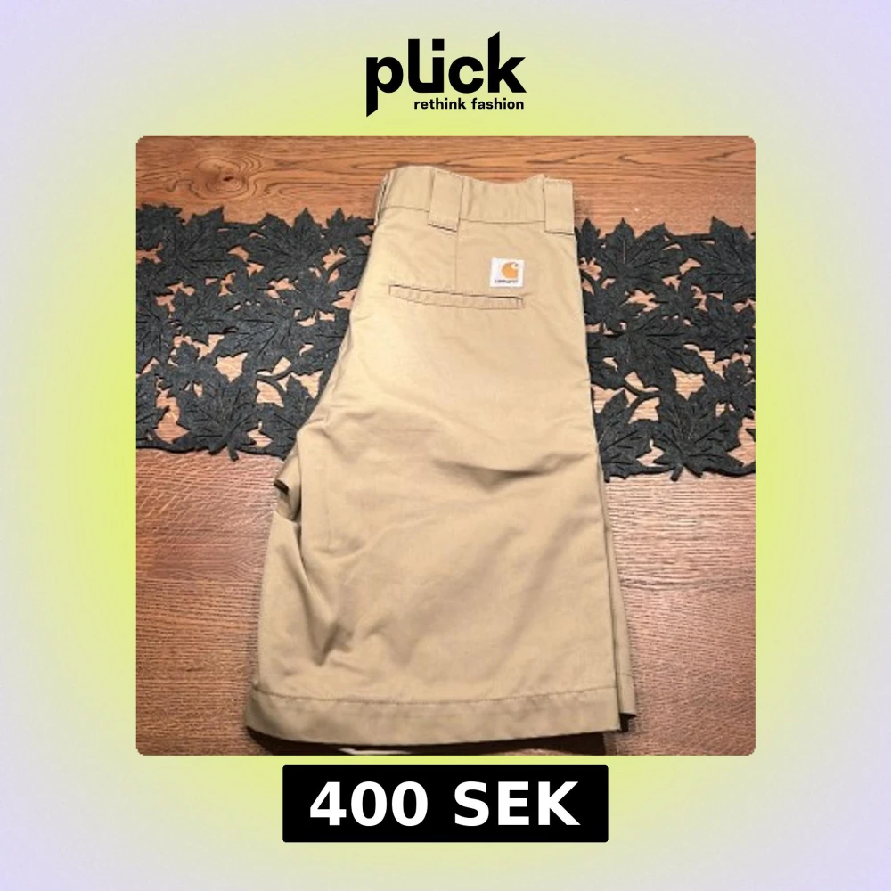 Säljer ett par klassiska beige chino shorts från Carhartt med raka ben och baggy passform. De är köpta i Tyskland i carhartt butik. De har bälteshällor, dragkedja och fickor både fram och bak. Perfekta för en chill sommarstil och tillverkade i slitstark bomull.