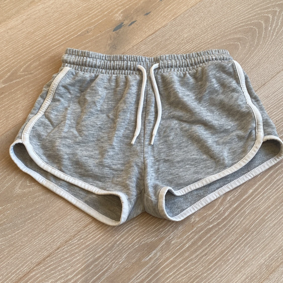 Grå sportshorts med vit kant och snörning i midjan. Mjukt bomullsmaterial och elastisk midja för skön passform. Perfekta för sommarens alla aktiviteter eller bara att chilla i. Klassisk sportig look med rundade benkanter.