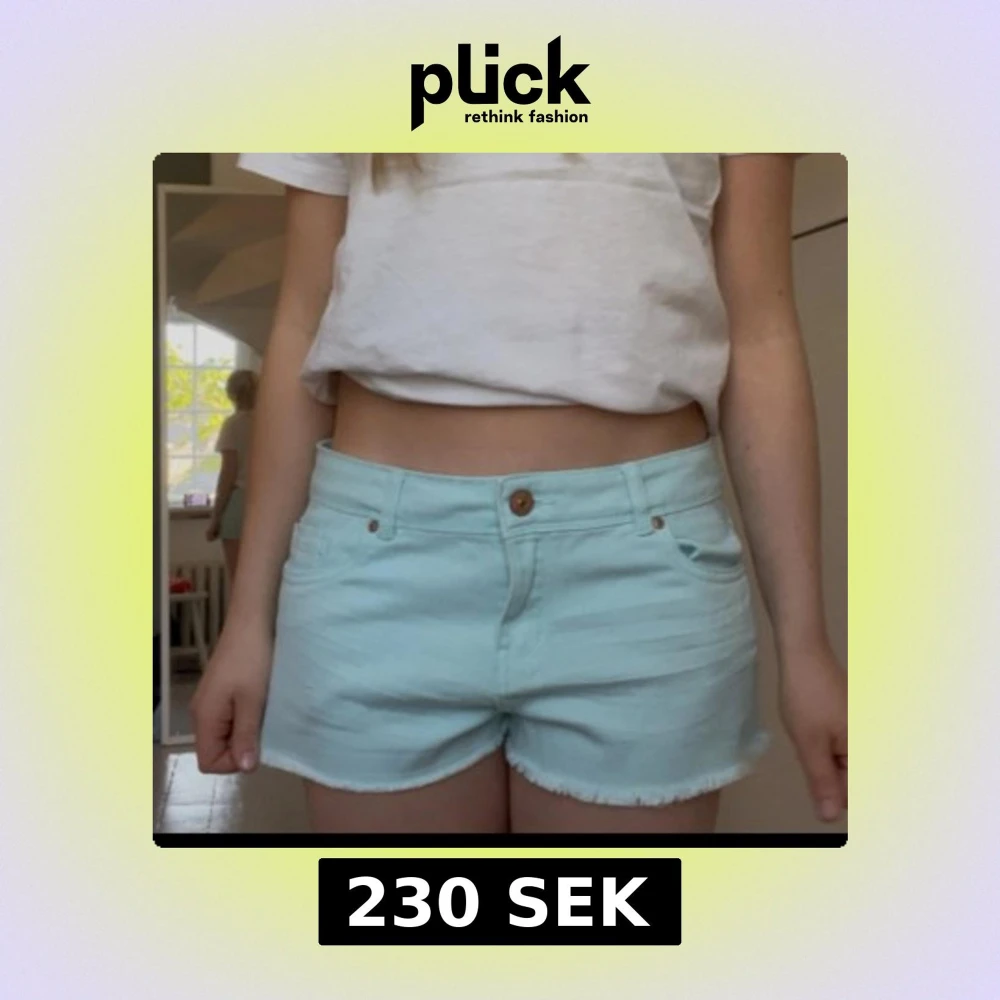 Säljer ett par lågmidjade ljusblå/turkosa jeansshorts. Bra skick. Perfekta till sommaren. 42 i midjemått, 88 runt om hela