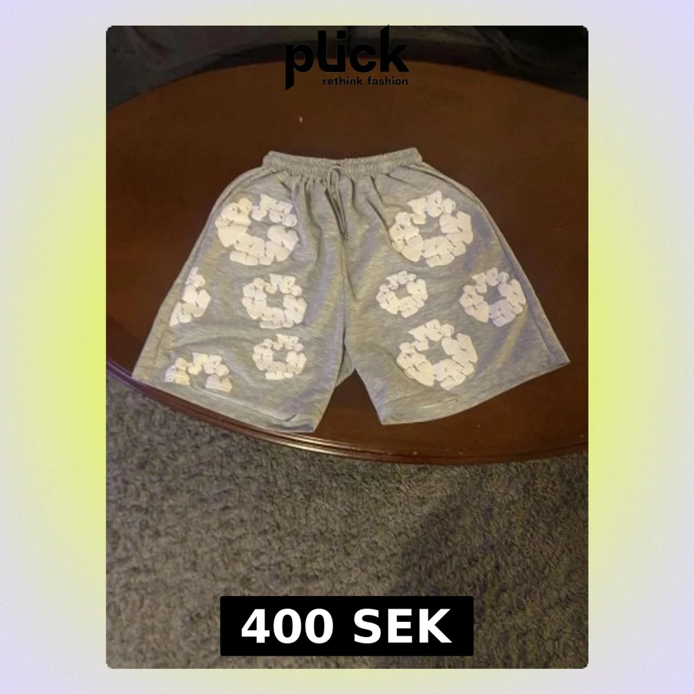 Säljer ett par grå shorts från Denim Tears med vita blommiga tryck över hela plagget. De har elastisk midja med snörning och är tillverkade i mjuk bomull. Perfekta för chill dagar och har en loose fit som ger skön streetwear-vibe.