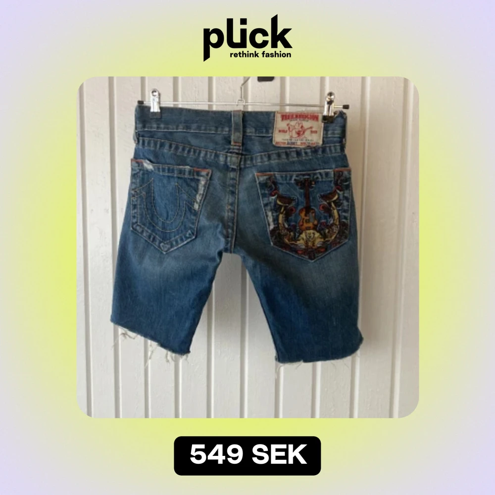 Avklippta jeans från True Religion som blivit shorts. Äkta, ”made in USA”, nypris var över 4000 kr. Dessa har även broderi på bakfickan. Storlek 28. Sista bilden är bara en ”inspo bild” för fit’en.