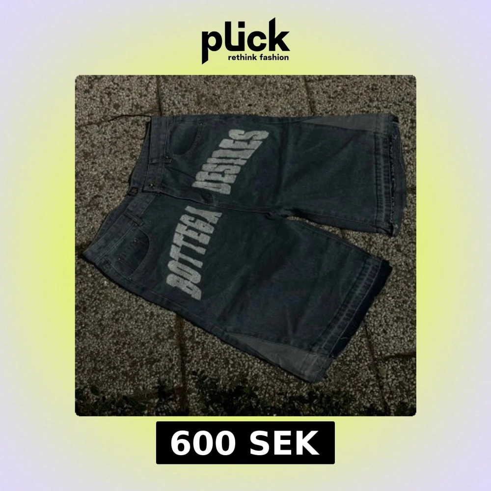 Säljer ett par blå jeansshorts från Rotten Desires med stort vitt tryck på framsidan. Shortsen har klassisk femficksdesign och normal passform. Perfekta för dig som vill sticka ut med en unik streetwear-look.