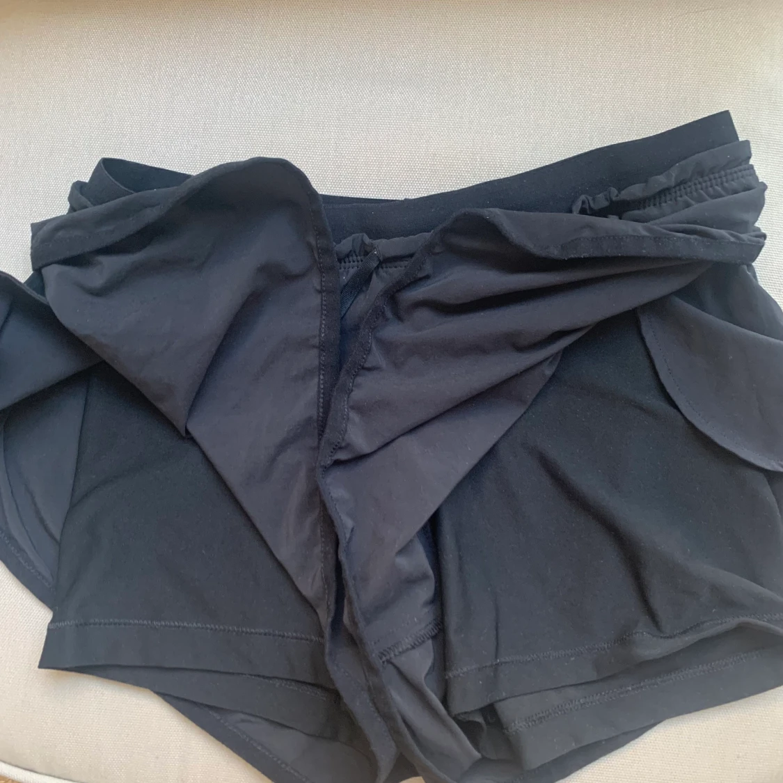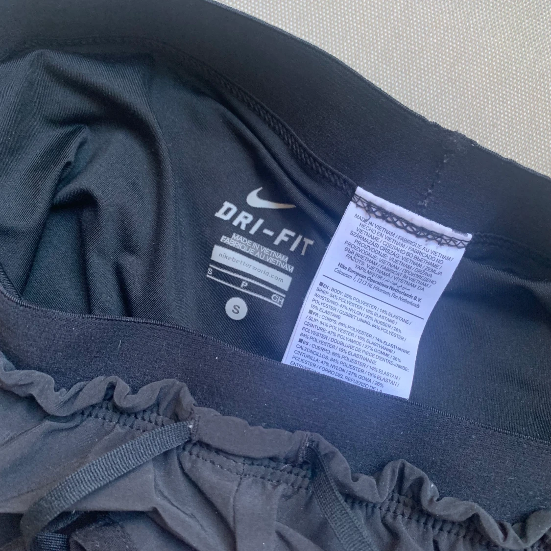 Svarta shorts från Nike, strl S. Skulle säga de e normala i storleken. Low Rise på dessa. Sidorna på yttershortsen sitter inte ihop (se bild) så de är väldigt rörliga! Underbyxorna sitter fast i shortsen. Går att dra åt med snörena. De har även fickor.