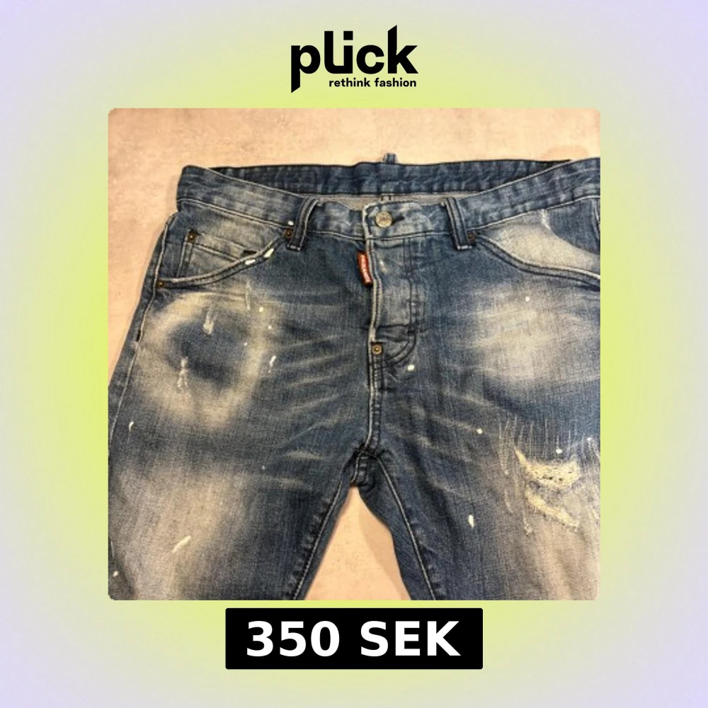 Säljer ett par blå jeansshorts från Dsquared2 med coola slitningar och blekta detaljer. Jeansen har klassisk femficksdesign, knappgylf och brunt läderpatch bak i midjan. Materialet är jeans och färgen är blå med ljusa partier och vita färgstänk för en edgy look.
