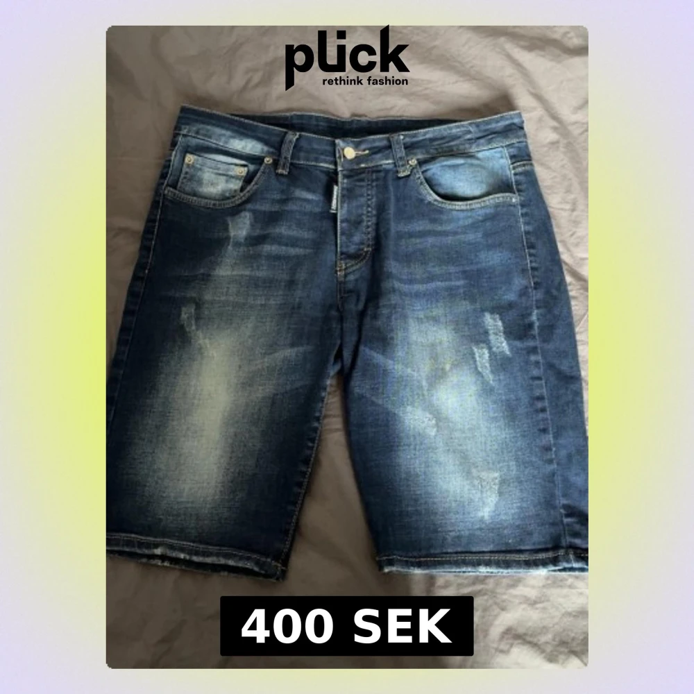 Säljer ett par snygga blå jeansshorts från Dsquared2 med slitna detaljer och klassisk femficksmodell. Shortsen har en cool tvättad look, knappgylf och kontrastsömmar. Perfekta för en avslappnad streetwear-stil.