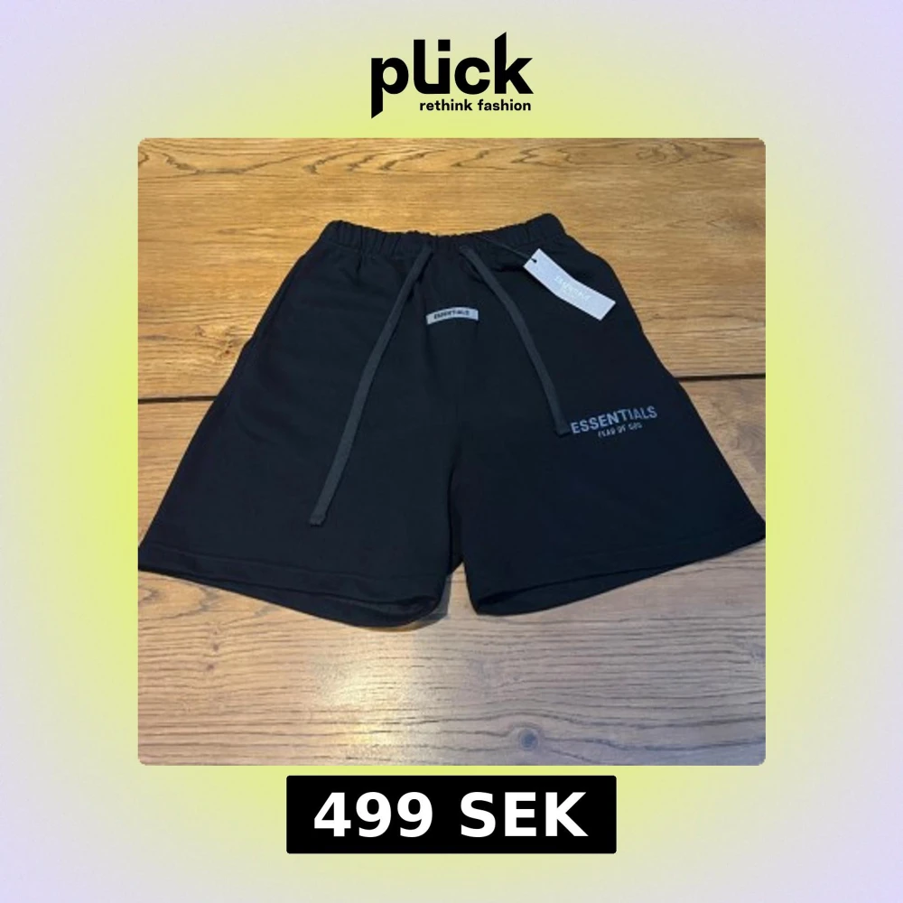 Svarta shorts från Essentials Fear of God med elastisk midja och långa snören framtill. Klassisk loose fit och diskret logga på vänster ben. Perfekta för chill dagar eller streetwear. Mjukt bomullsmaterial och bakficka för extra stilpoäng. Pris kan diskuteras. Längd: 47cm