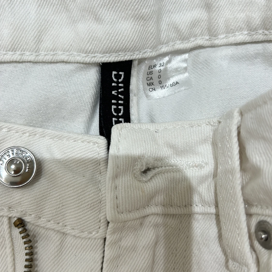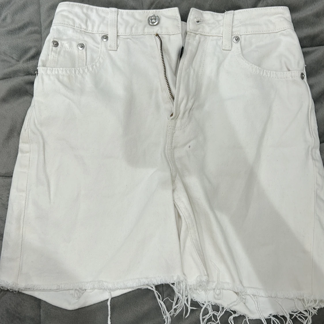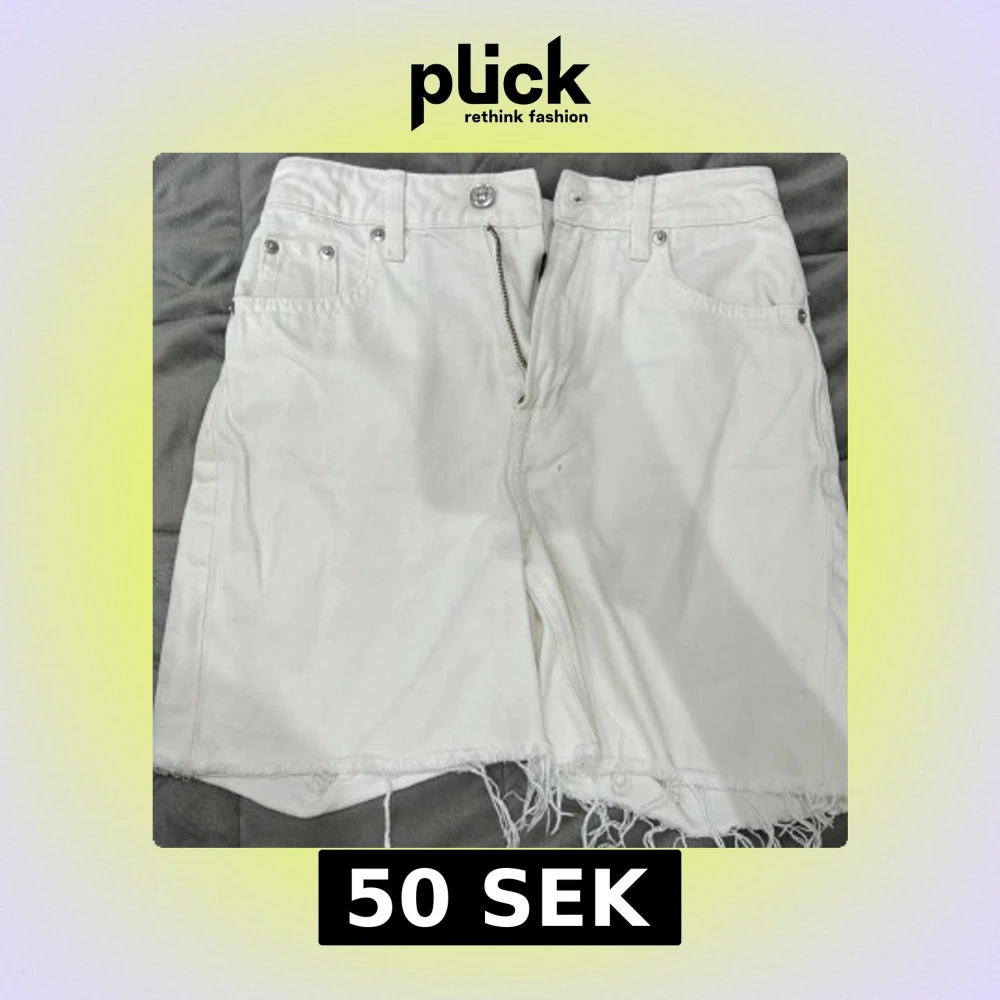 Säljer en vit jeansshort från Divided med råa kanter och klassiska fickor fram. Kjolen har dragkedja och knapp framtill samt bälteshällor. Perfekt för en trendig och avslappnad look.