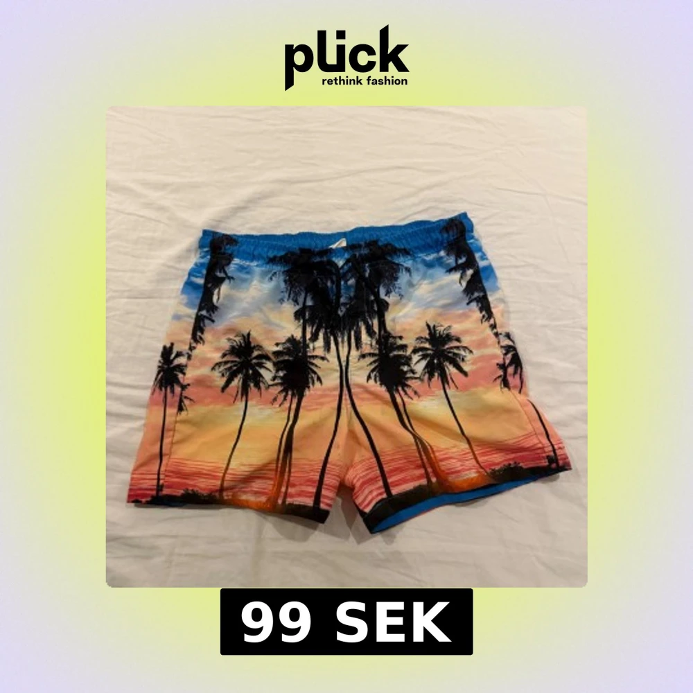 Säljer ett par färgglada badshorts från Calliope med tropiskt palmmotiv i blått, orange, rosa och svart. Shortsen har elastisk midja med snörning och innerbyxa i mesh. Perfekta för stranden eller poolen!
