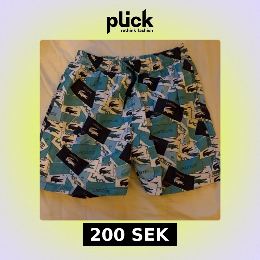 Säljer ett par snygga badshorts från Lacoste med elastisk midja och snörning. Shortsen har ett färgstarkt mönster med Lacoste-loggor i blått, svart, vitt och grönt. Perfekta för sommaren och riktigt sköna att bära till stranden eller stan.
