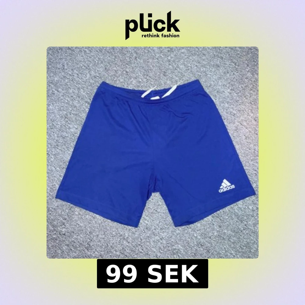 Säljer ett par blå sportiga shorts från Adidas med vit logga på benet. De har elastisk midja med snörning. Hör av dig vid funderingar eller behov av fler bilder.
