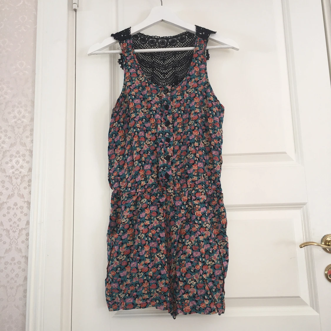 Blommig (lila, grön & orange) shortsdress, svart virkad bak, stängs med knappar och fickor på sidorna.