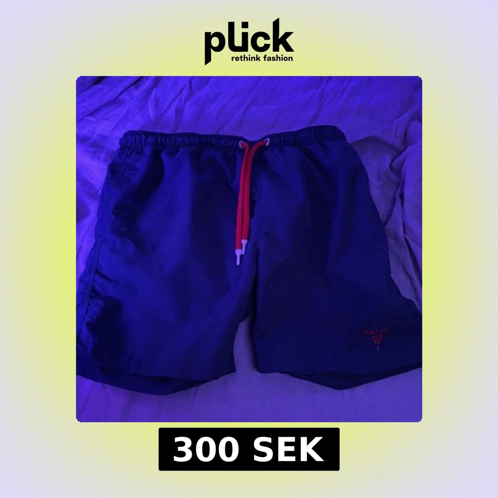 Snygga marinblå badshorts från GANT med röd broderad logga och sköld på ena benet. Shortsen har elastisk midja med röd snörning och en bakficka. Perfekta för stranden eller poolen, klassisk stil och bekväm passform.