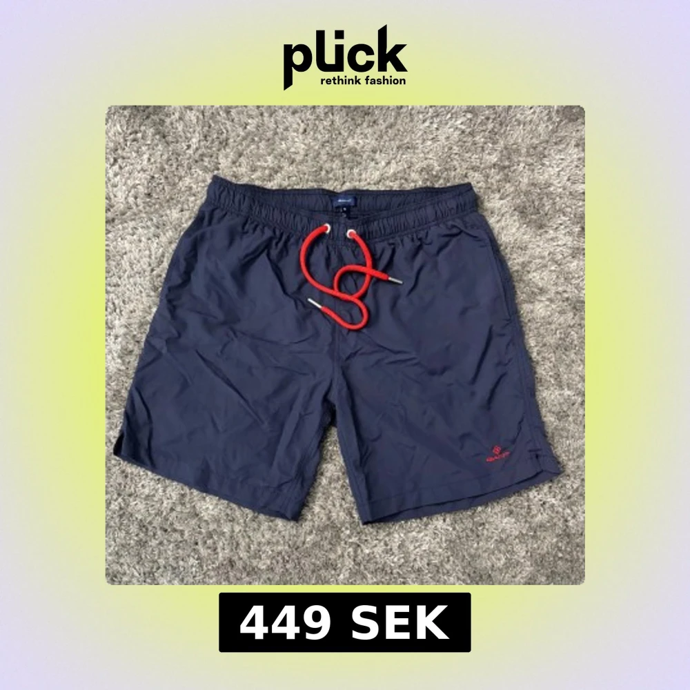 Snygga marinblå badshorts från Gant med röd snörning i midjan med en logga på ena benet. Shortsen har elastisk midja och en bakficka med kardborrestängning. Perfekta för stranden eller poolen. Byxorna har inga defekter och kostar 700 kr vid nypris. Använda fåtal gånger. 100% äkta badbyxor från Gant