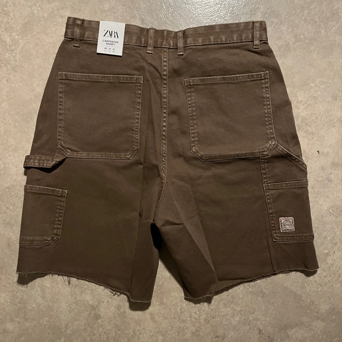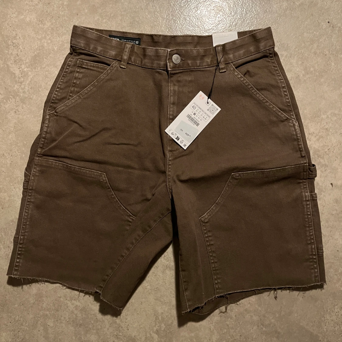 Säljer ett par bruna cargoshorts från Zara med flera praktiska fickor och råa benslut. Shortsen har normal passform och är tillverkade i ett kraftigt bomullsmaterial. Perfekta för en avslappnad stil.