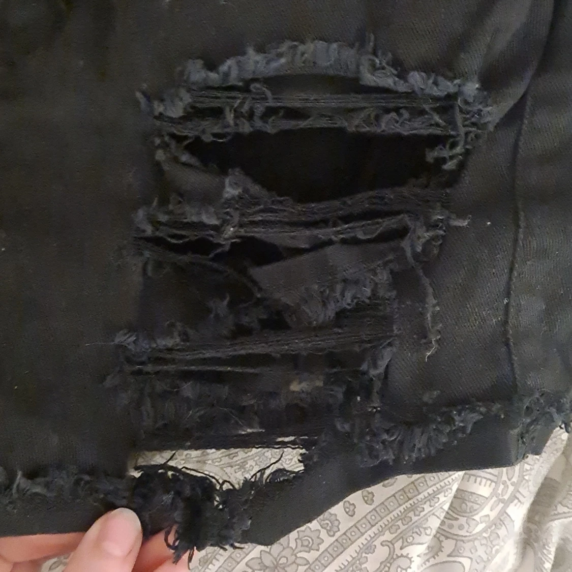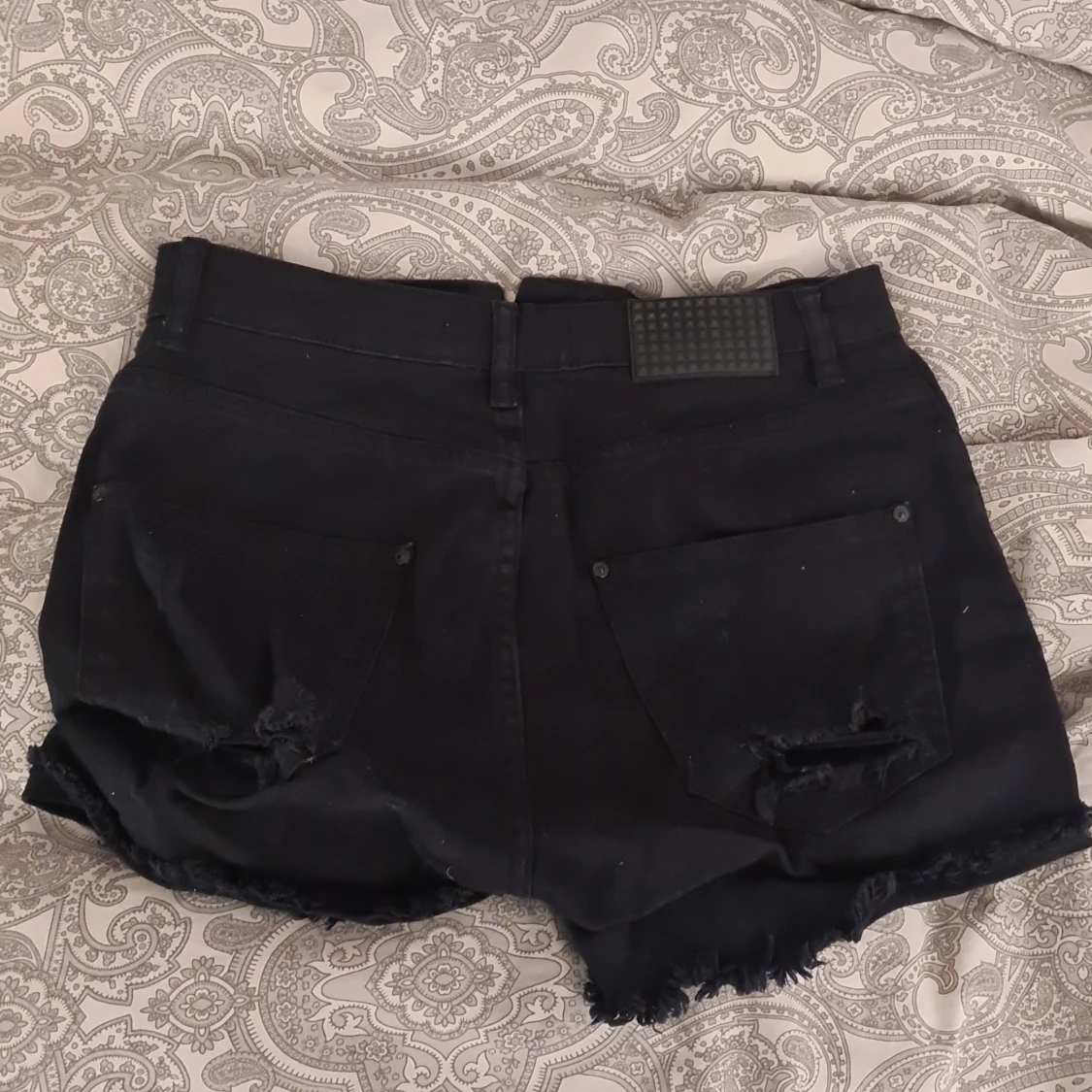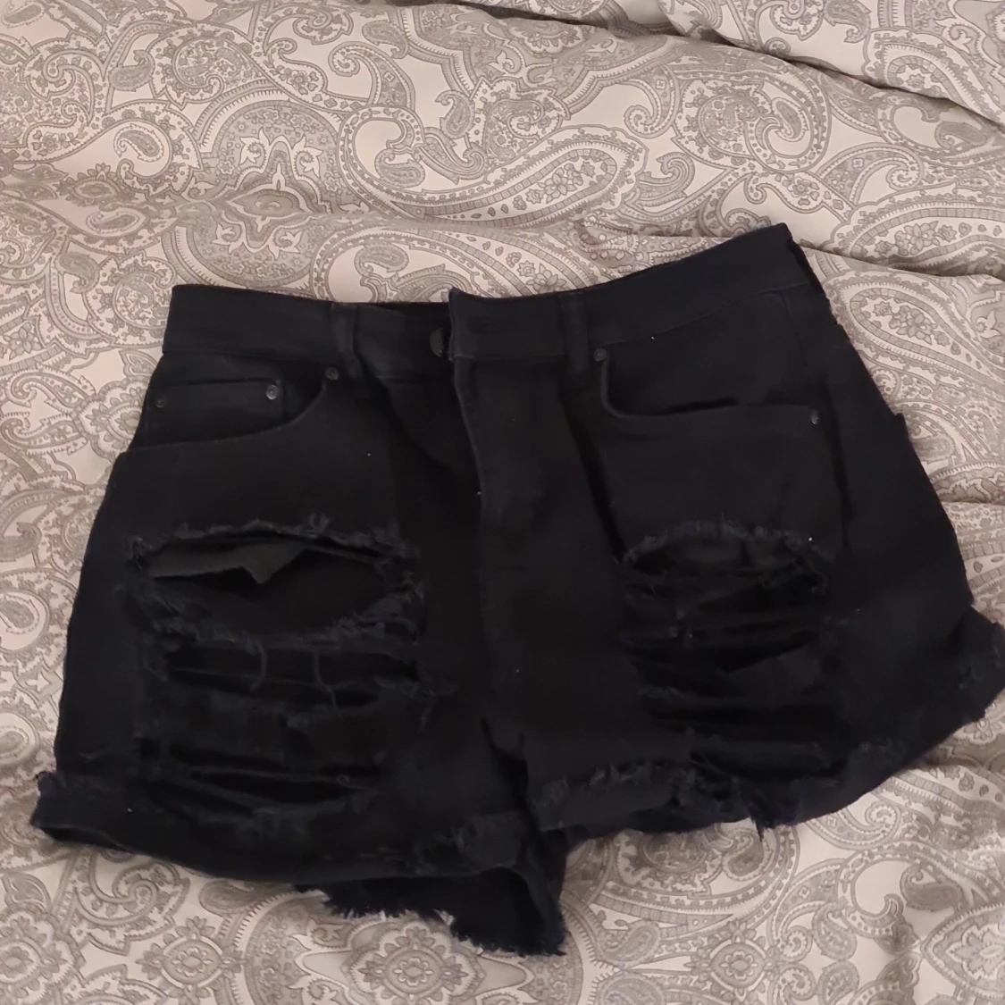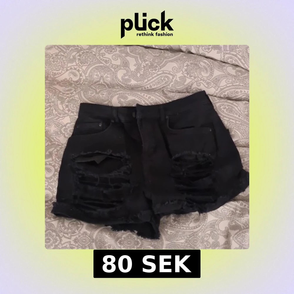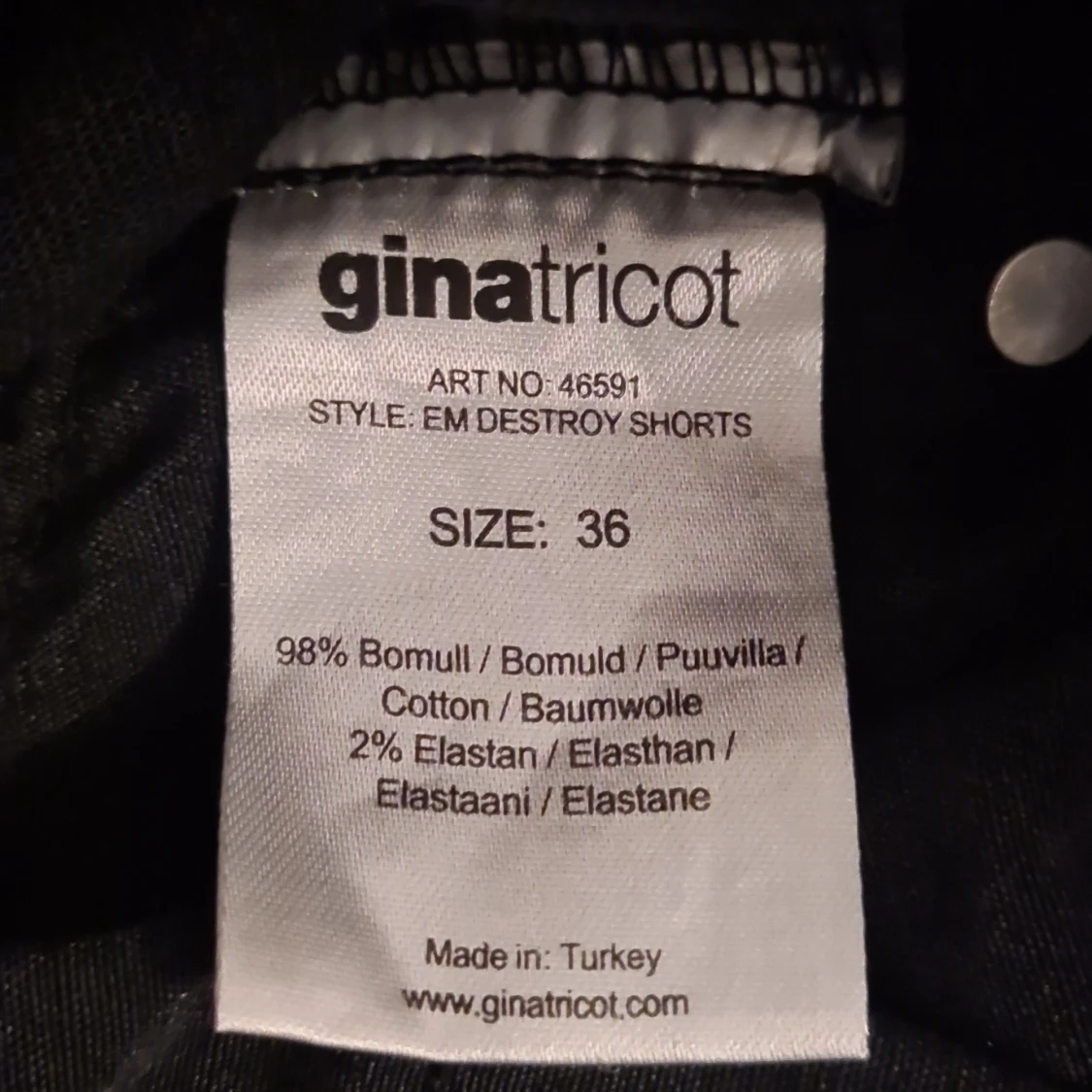 Svarta jeansshorts från Gina Tricot med råa kanter och stora slitningar framtill. Modellen är klassisk femficksdesign med hög midja och korta ben. Materialet är mestadels bomull med lite elastan för stretch.