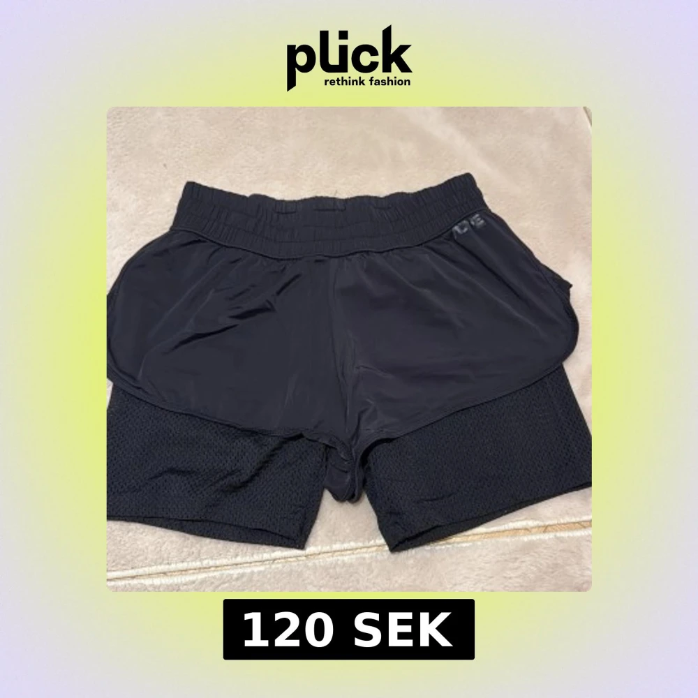 Svarta träningsshorts från Gina Tricot med elastisk midja och dubbla lager. Yttertyget är slätt och glansigt medan innertyget är i mesh för extra komfort. Perfekta för gymmet eller löprundan, riktigt sköna och snygga.