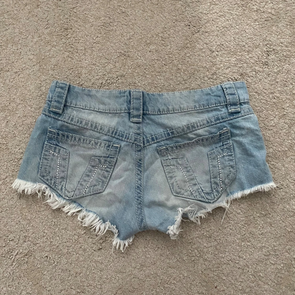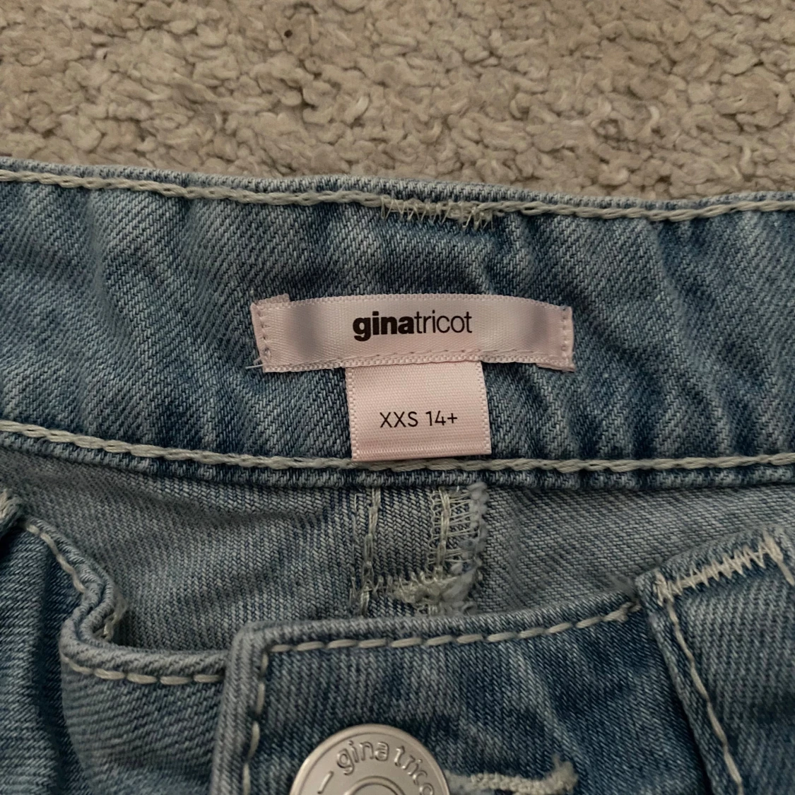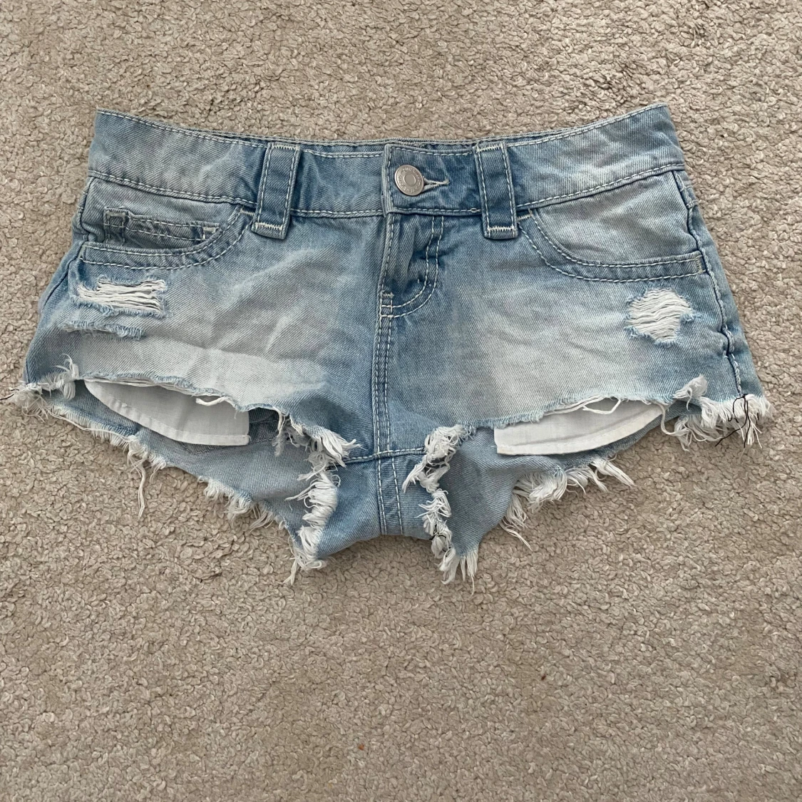 Snygga ljusblå jeansshorts från Gina Tricot teen i storlek XXS. Modellen har låg midja, slitna detaljer och fransiga kanter för en cool vibe. Klassiska fickor fram och bak, med dekorativa sömmar på bakfickorna. Perfekta för varma sommardagar!
