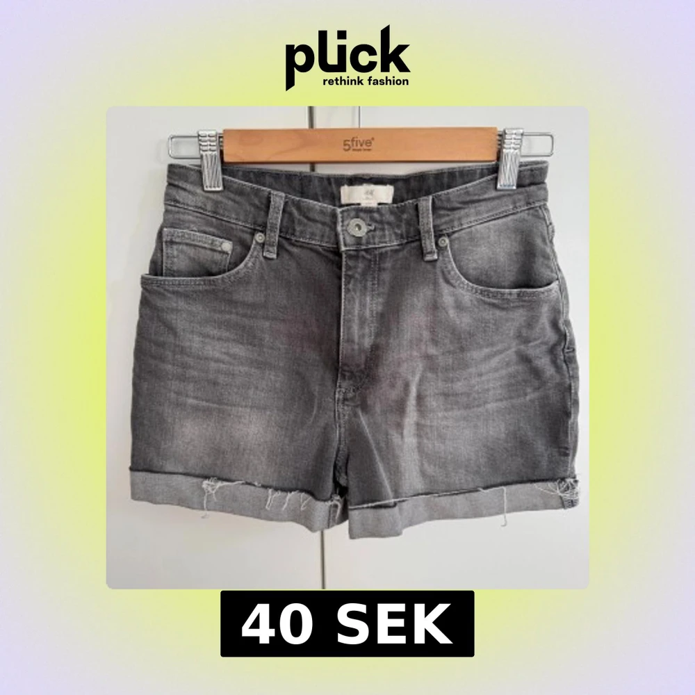 Gråa jeansshorts från H&M i storlek 34/XS med klassisk femficksdesign och råa, upprullade benslut. Modellen är midwaist och har knapp och dragkedja framtill. Aldrig använda och säljs då de numera är för små för mig.