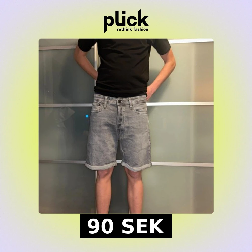 Säljer ett par grå jeansshorts från Jack & Jones med klassisk femficksdesign och uppvikta benslut. Shortsen har normal passform och stängs med knapp och dragkedja. Perfekta för dig som gillar enkel och stilren denim-look.