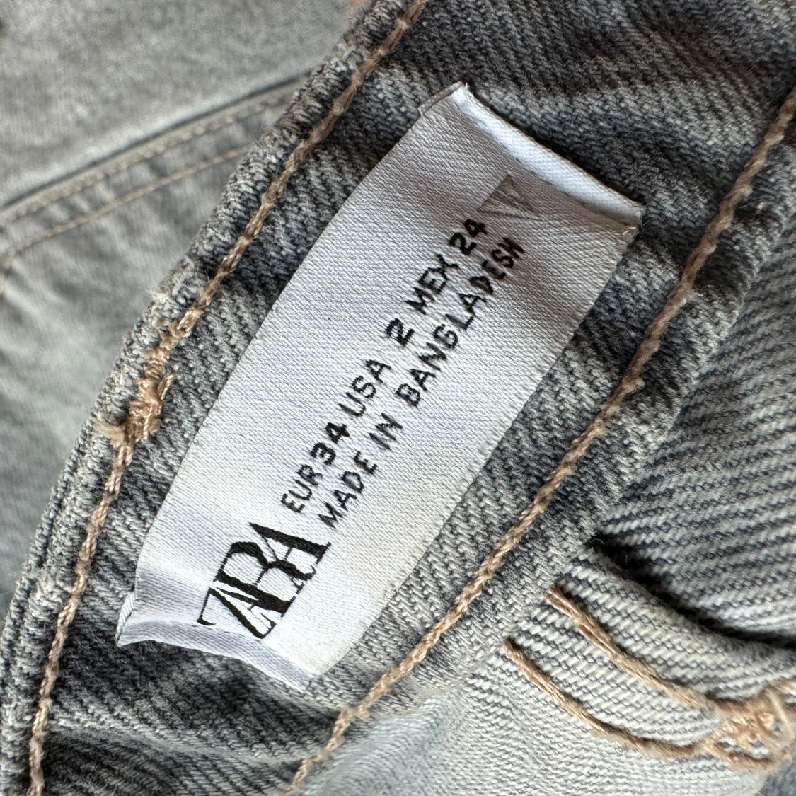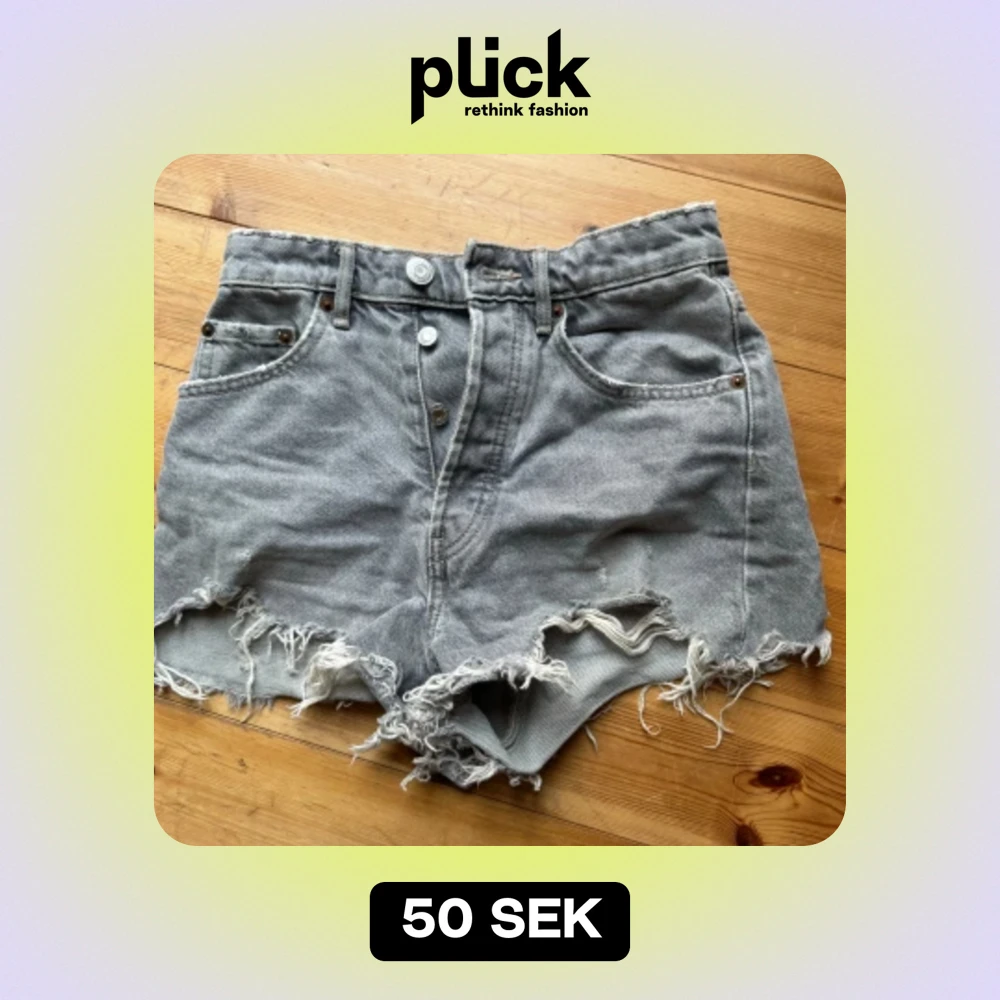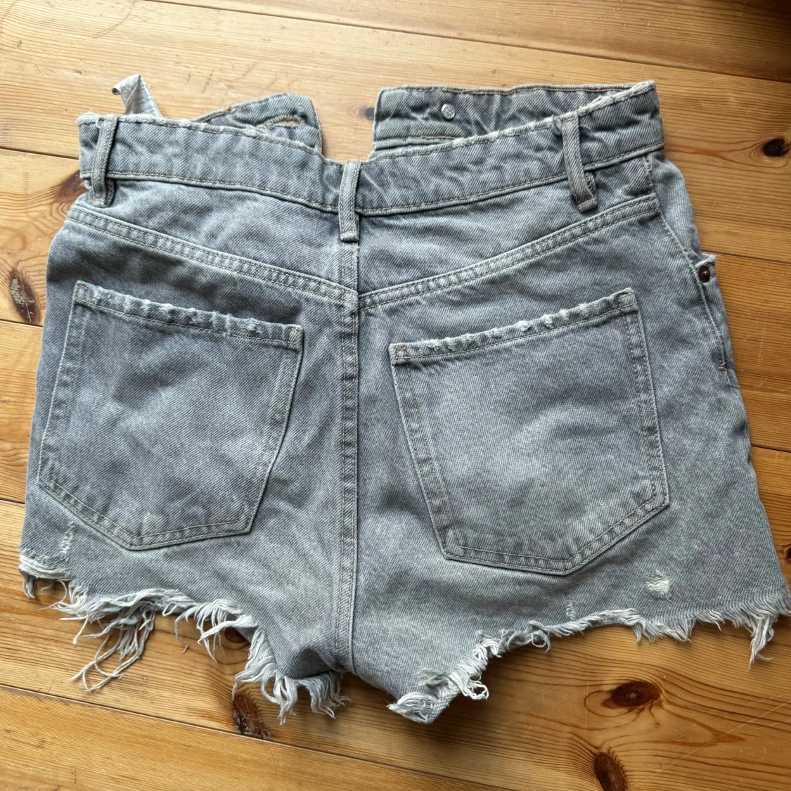 Säljer ett par grå jeansshorts från Zara i storlek XS. De har en cool, sliten look med fransiga kanter, midrise. Perfekta för sommaren och festivaler! 🕶️