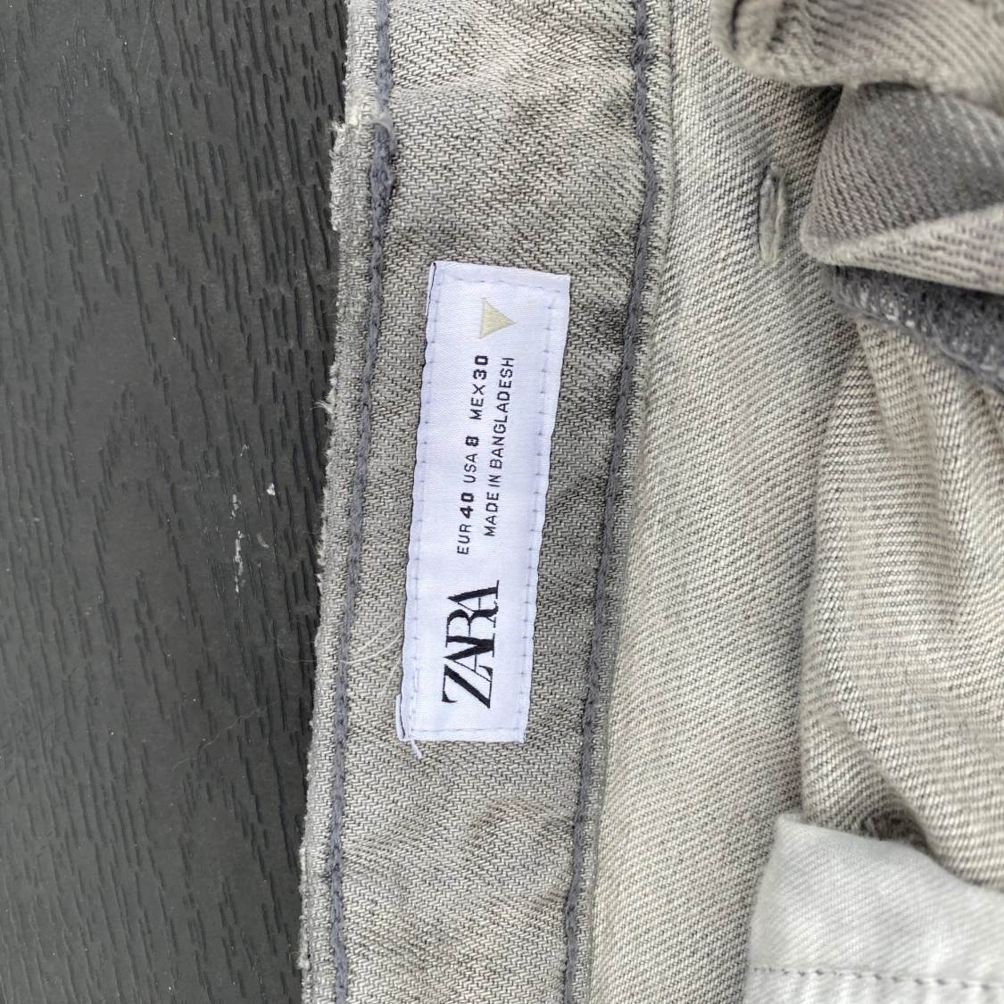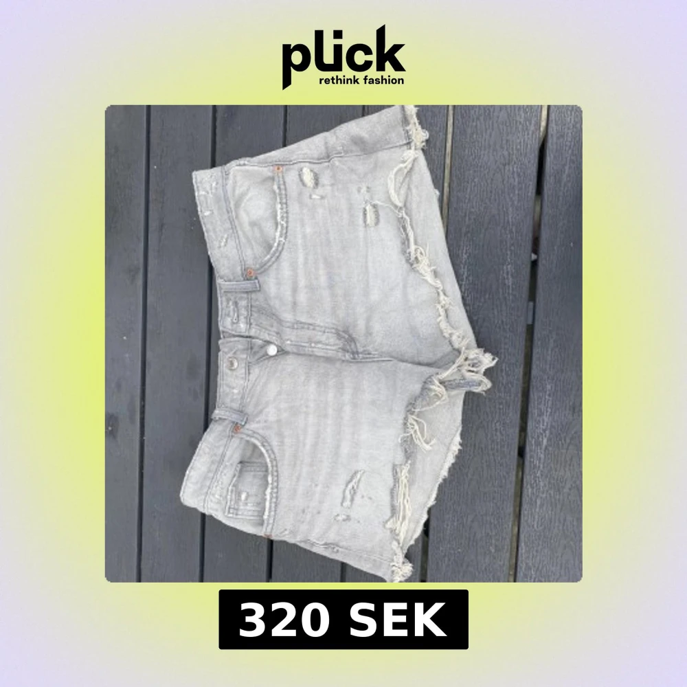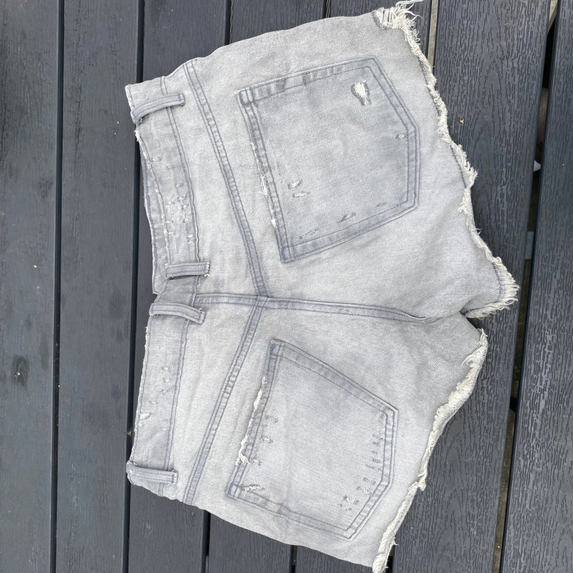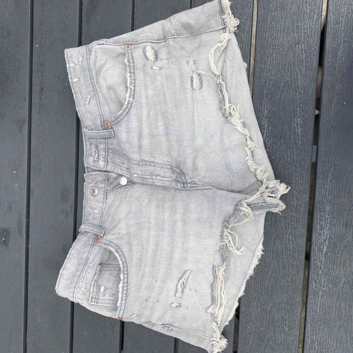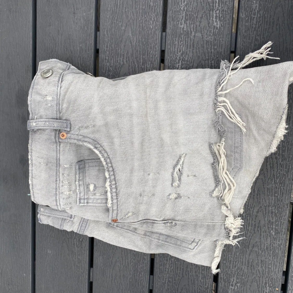 Snygga grå jeansshorts från Zara med slitna detaljer och fransad kant. Modellen är högmidjad och har klassiska fickor både fram och bak. Dem har en tvättad look men fina kontraster