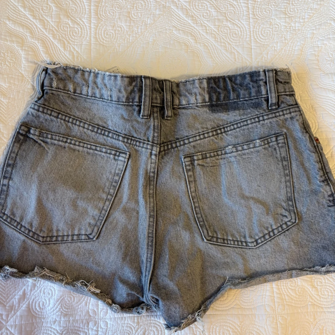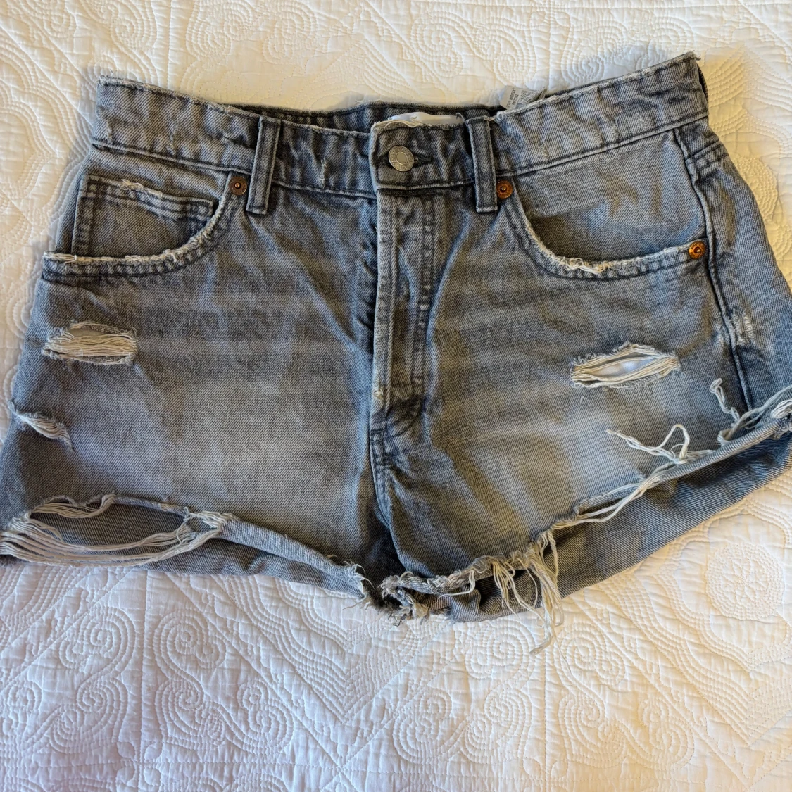 Säljer ett par grå jeansshorts med coola slitningar och fransiga kanter. Shortsen har en klassisk femficksdesign och knappgylf. Perfekta för en avslappnad stil.