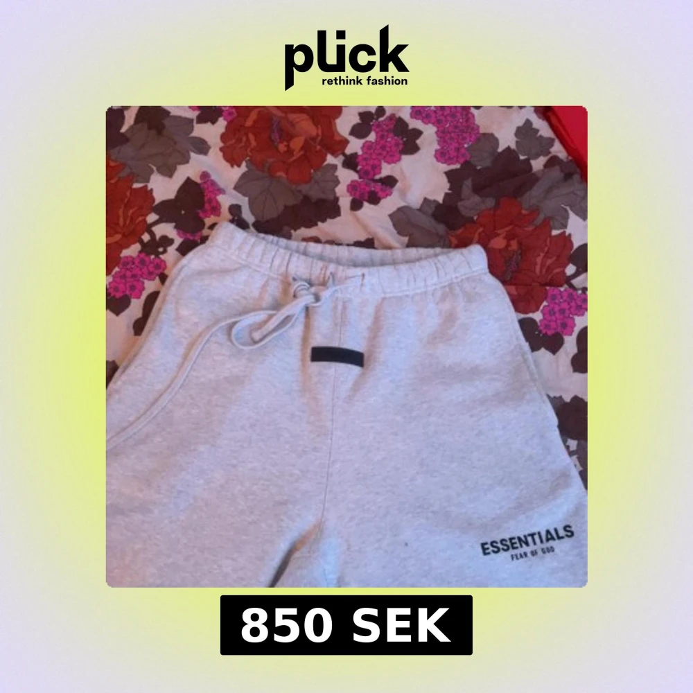 Snygga ljusgrå shorts från Essentials Fear of God i storlek S. De har elastisk midja med snörning och svart logotypdetalj framtill. Mjukt bomullsmaterial som är perfekt för chill eller träning. Klassisk och clean design med tryckt logga på benet.